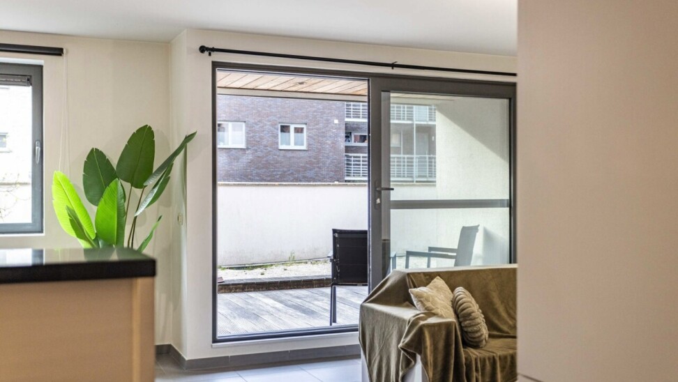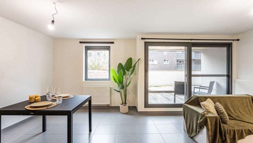 Depuis le séjour, vous avez un accès direct à la terrasse orientée plein sud, où vous pourrez profiter du soleil en toute tranquillité.