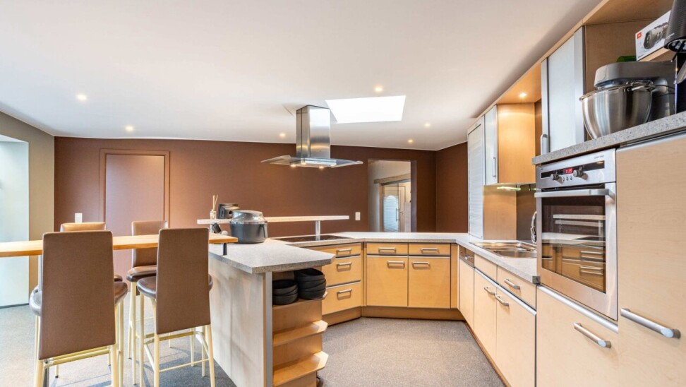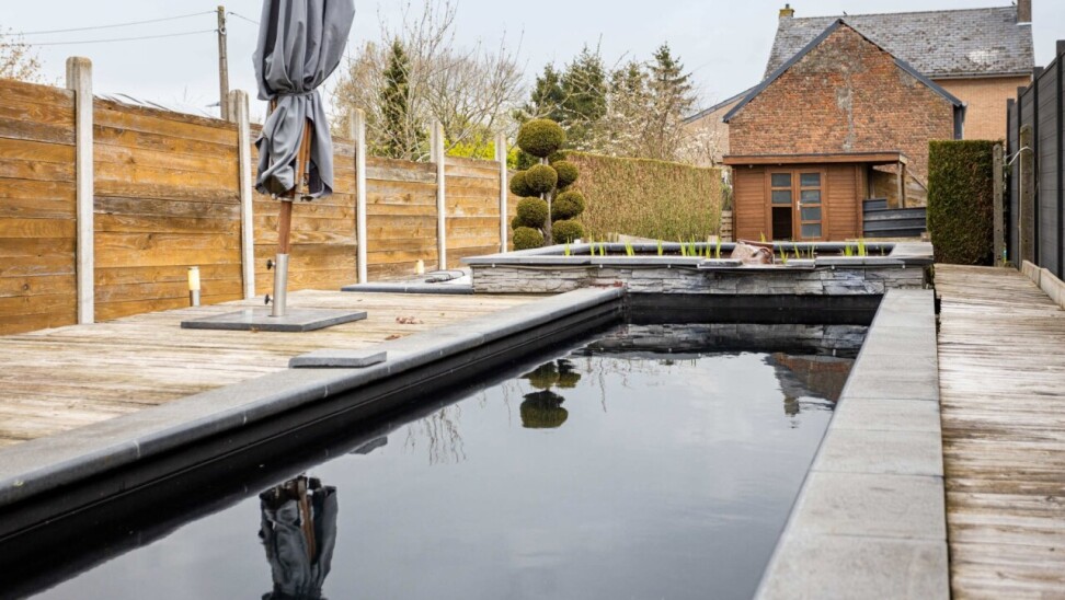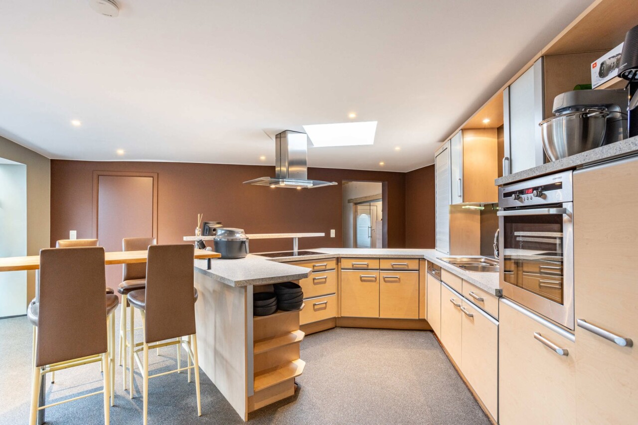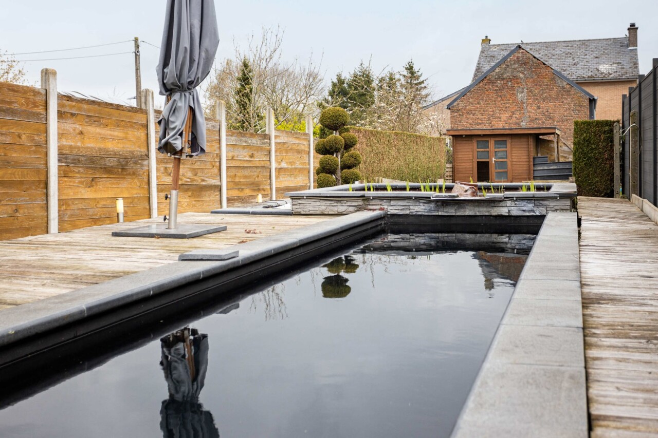 Dans le prolongement se trouve le séjour chaleureux avec vue sur le jardin et l’étang de baignade. Ensemble, la cuisine et l’espace de vie forment un lieu convivial et accueillant où toute la famille peut se détendre.