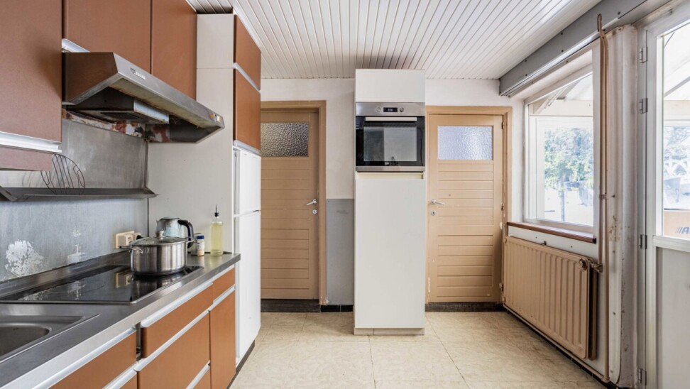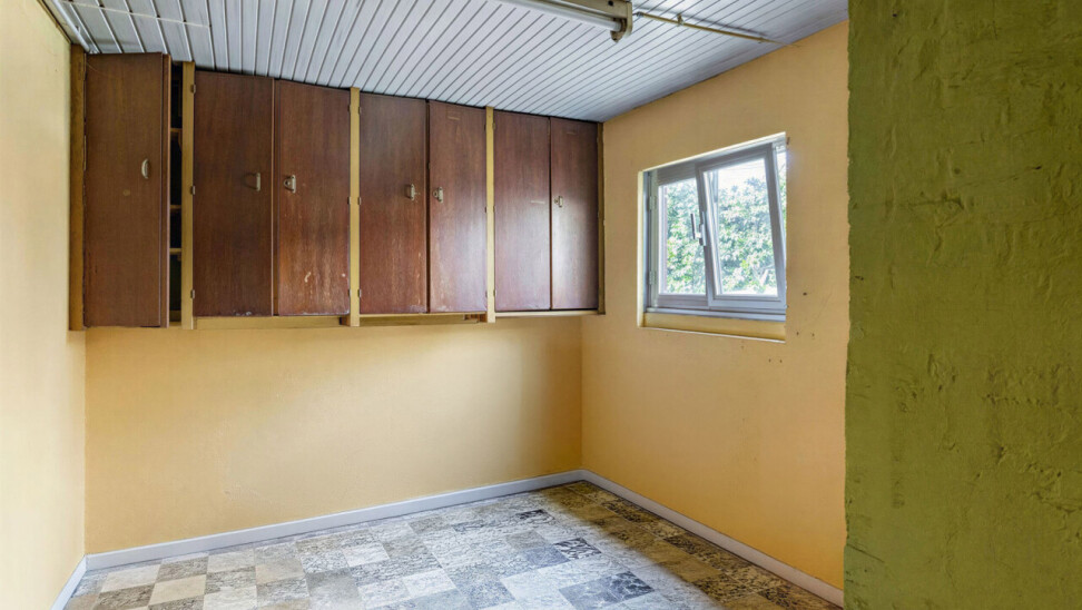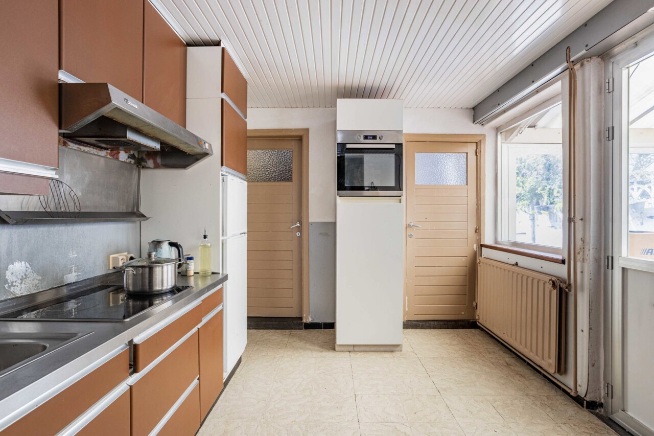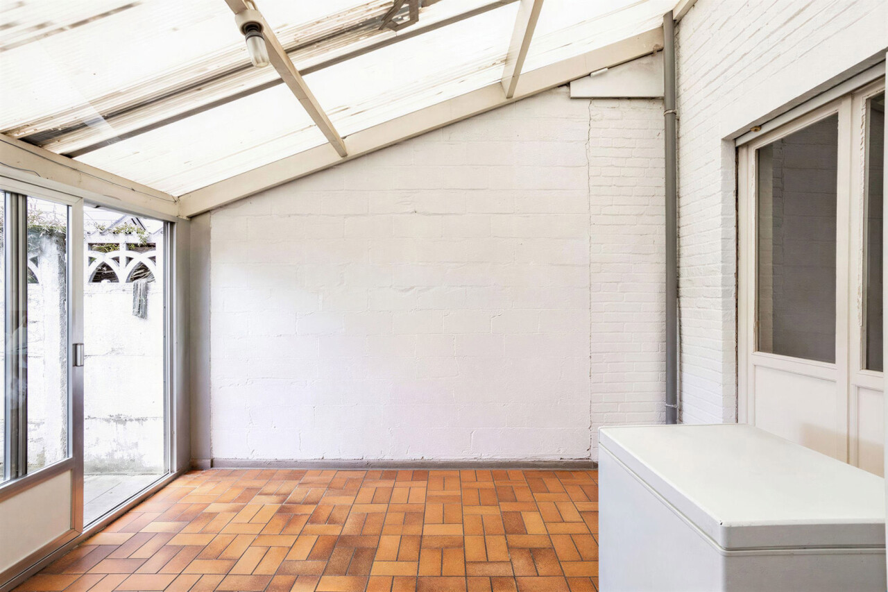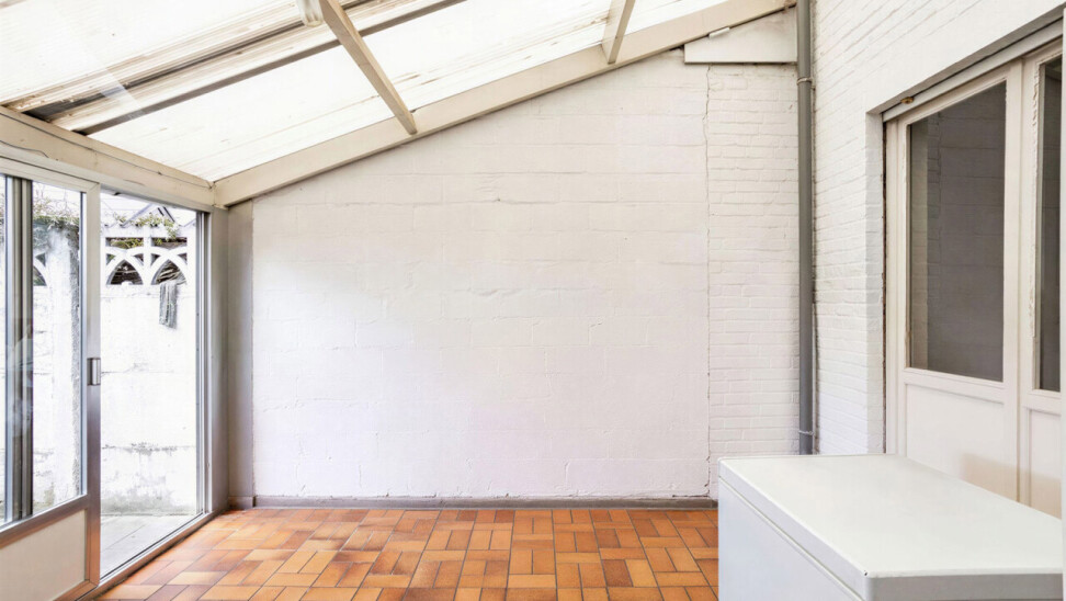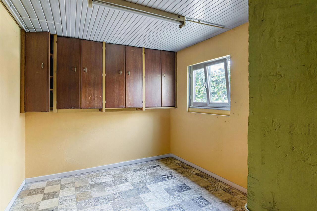 Nous accédons à la maison par un hall d’entrée lumineux, donnant directement sur le spacieux séjour et la salle à manger (33 m²), avec vue sur la véranda et la terrasse/cour orientée plein sud à l’arrière. La cuisine, attenante, est équipée du confort de base. Ce niveau comprend également un espace de rangement pratique et un WC invités.