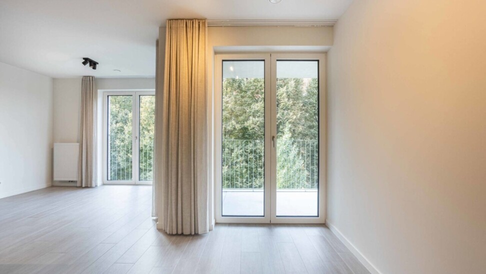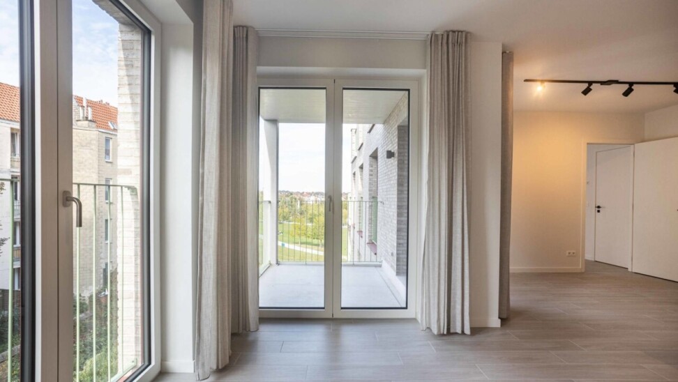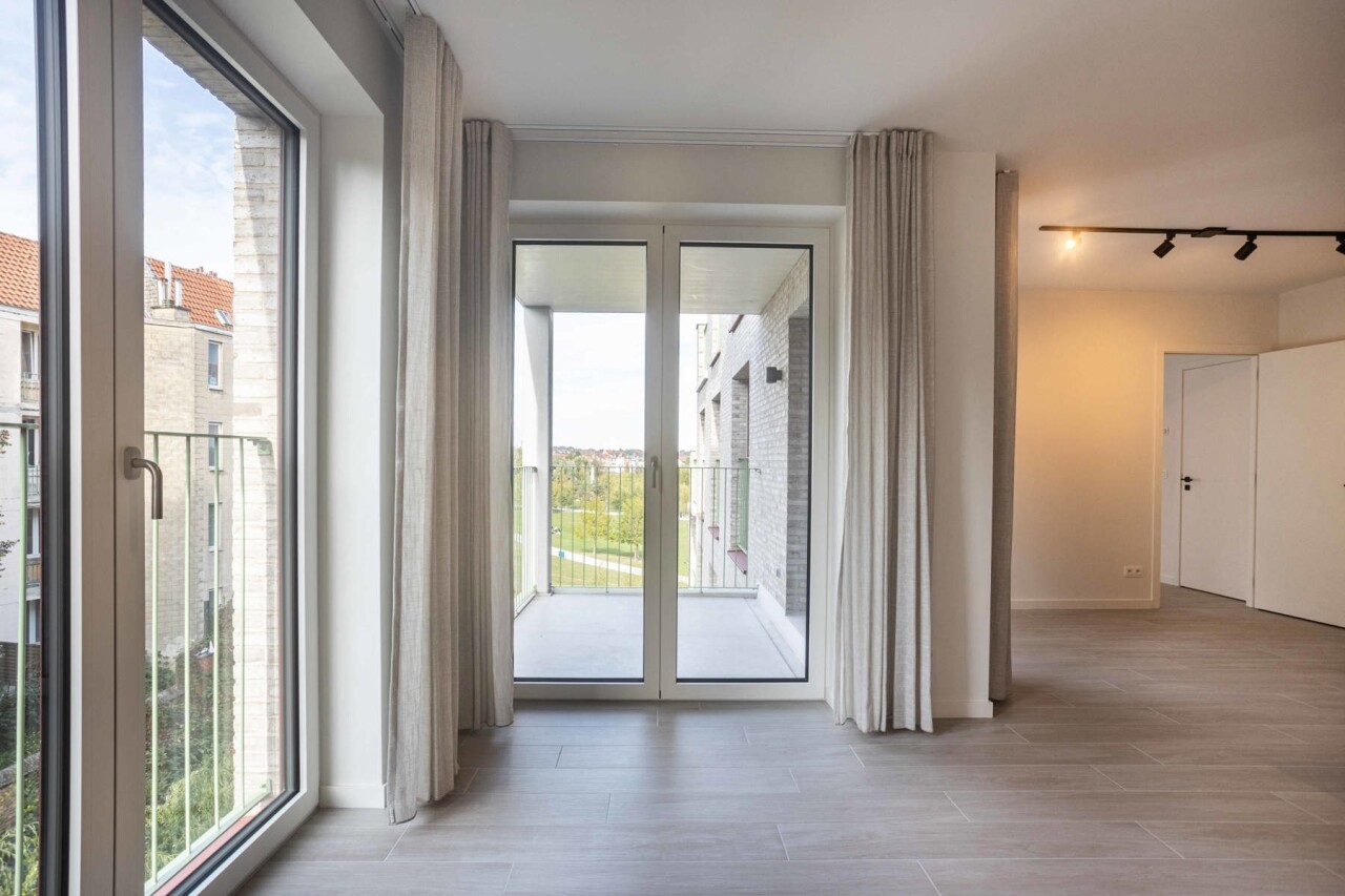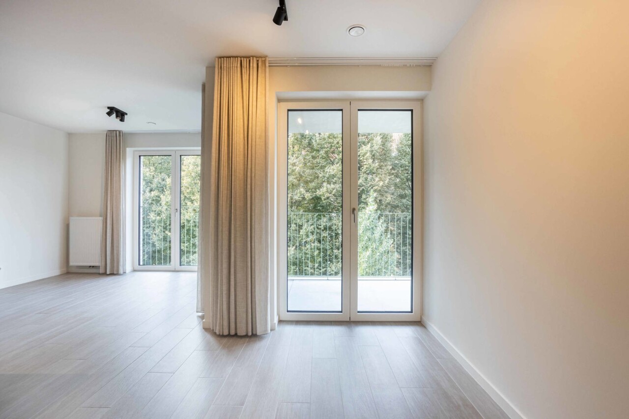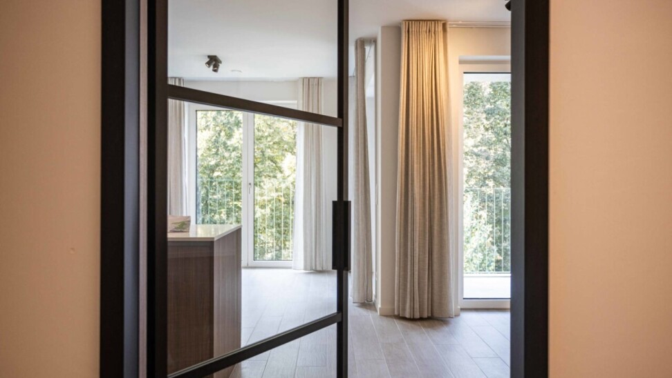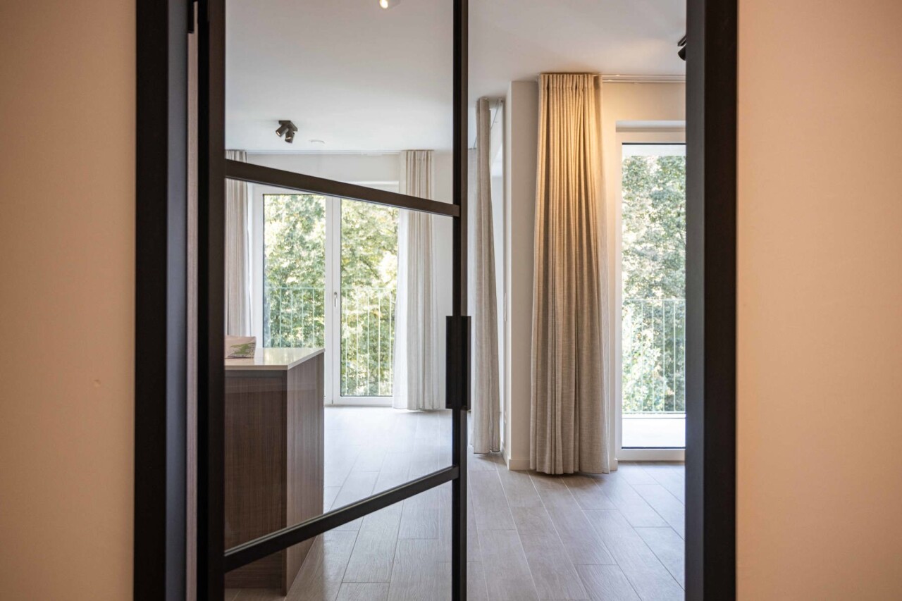 De stijlvolle stalen deur leidt naar de lichtrijke woon- en eetkamer, dankzij de grote raampartijen. Vanuit de leefruimte heeft u directe toegang tot het terras van 7 m² met een prachtig uitzicht over het park.