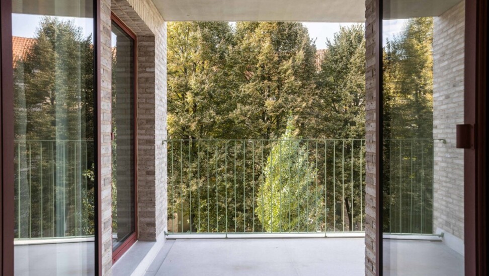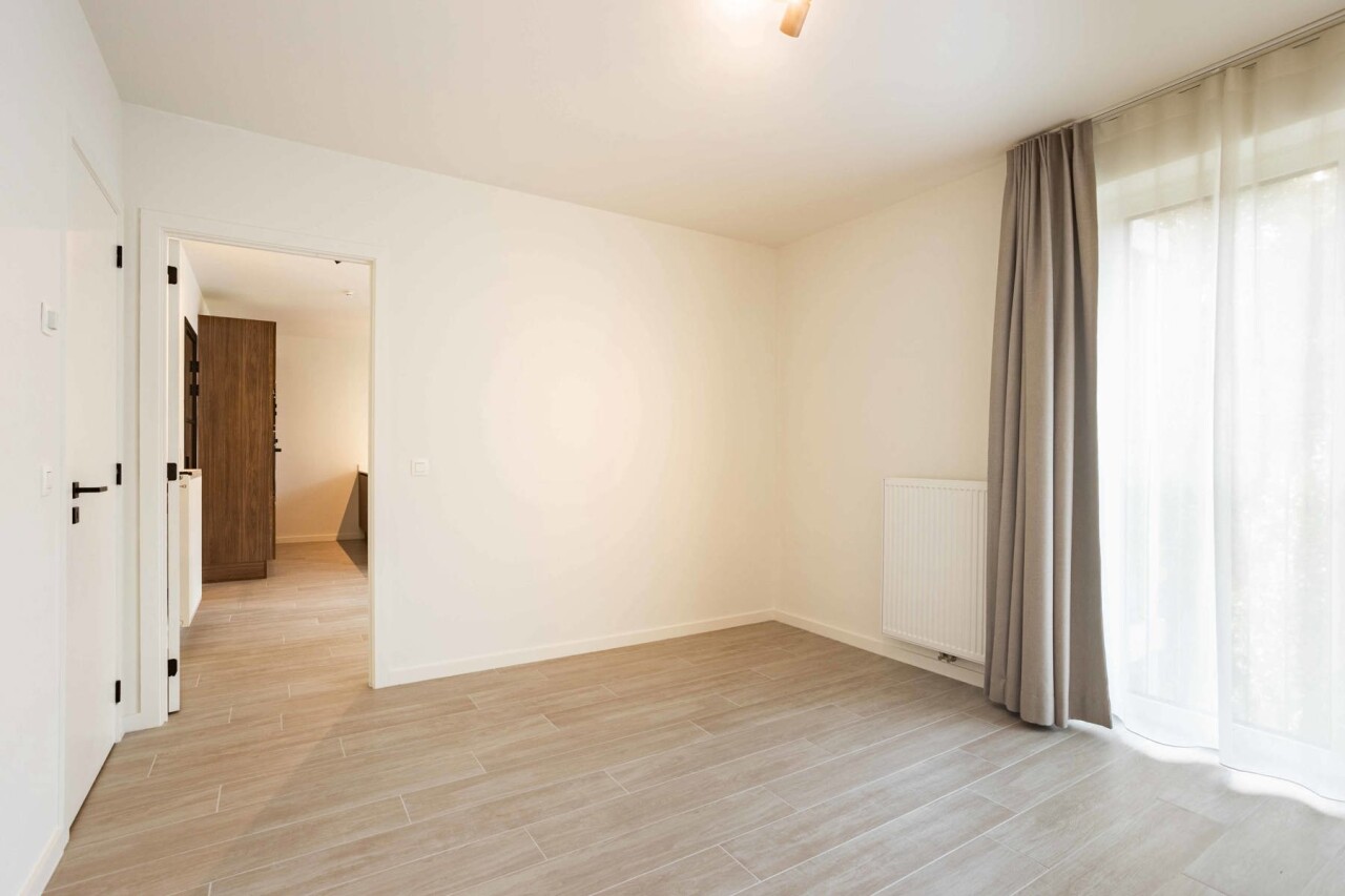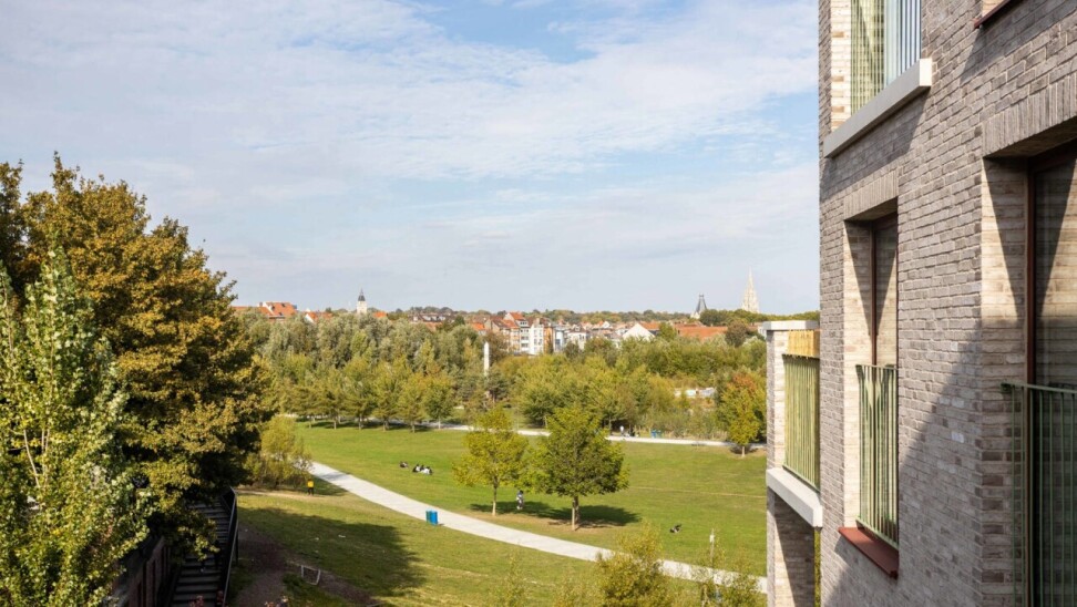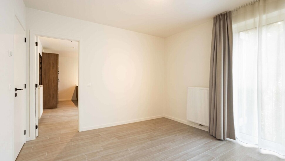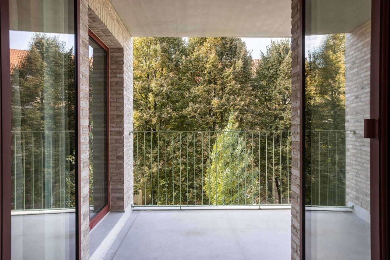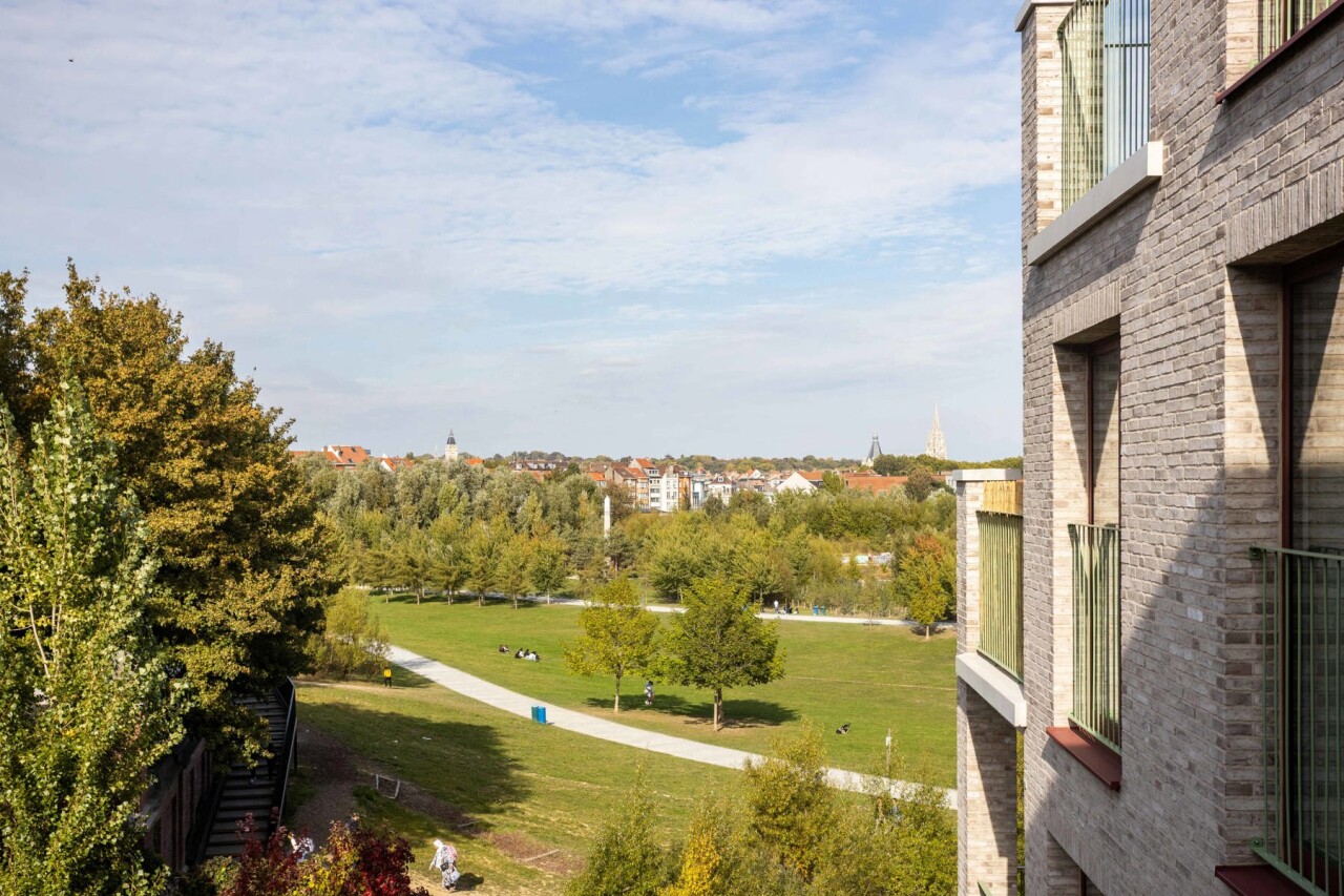 De stijlvolle stalen deur leidt naar de lichtrijke woon- en eetkamer, dankzij de grote raampartijen. Vanuit de leefruimte heeft u directe toegang tot het terras van 7 m² met een prachtig uitzicht over het park.