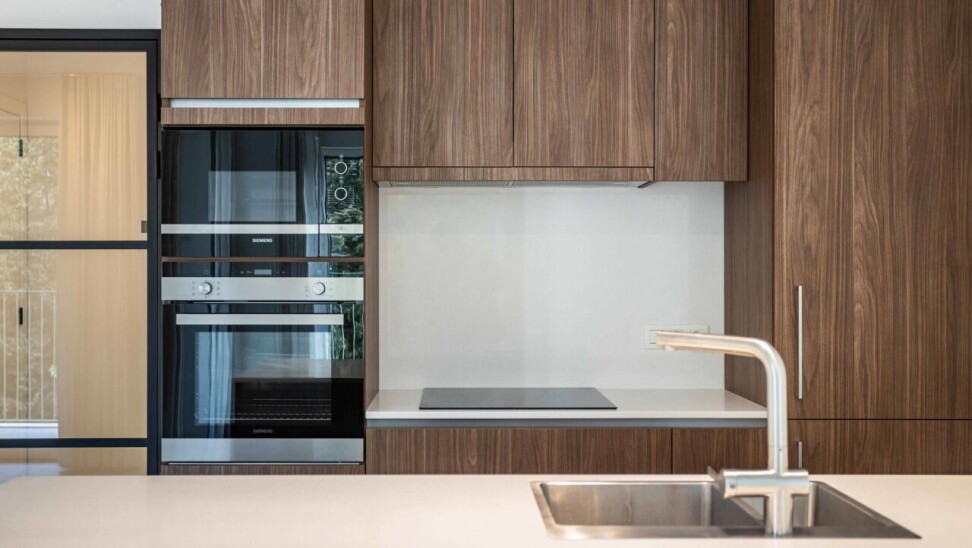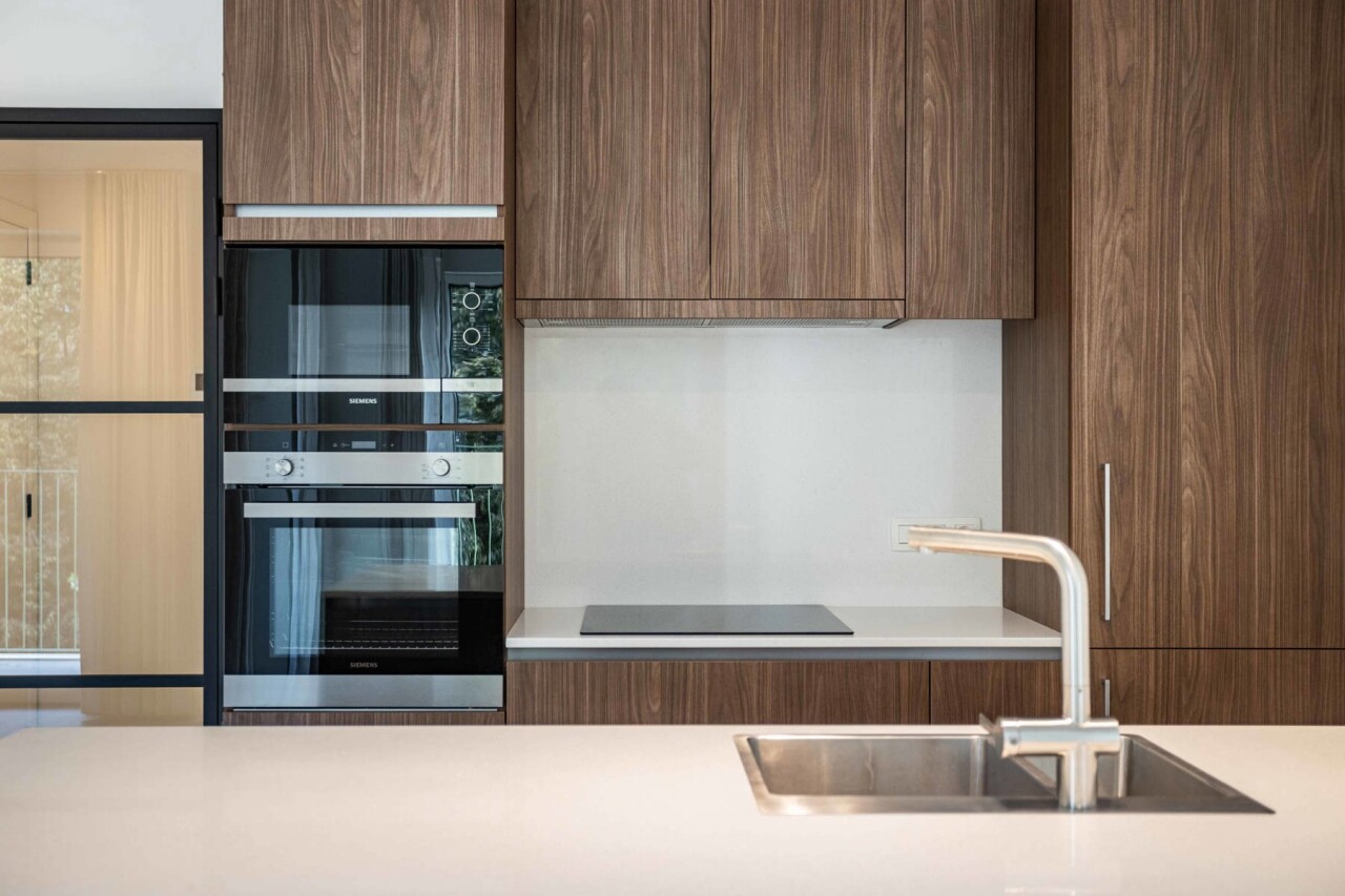 De open keuken, volledig uitgerust met toestellen van Siemens (koelkast, diepvries, oven, microgolfoven en vaatwasser), is strak en smaakvol ingericht.