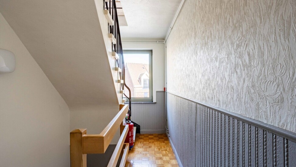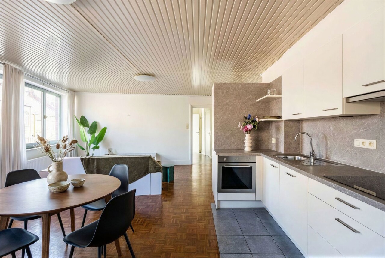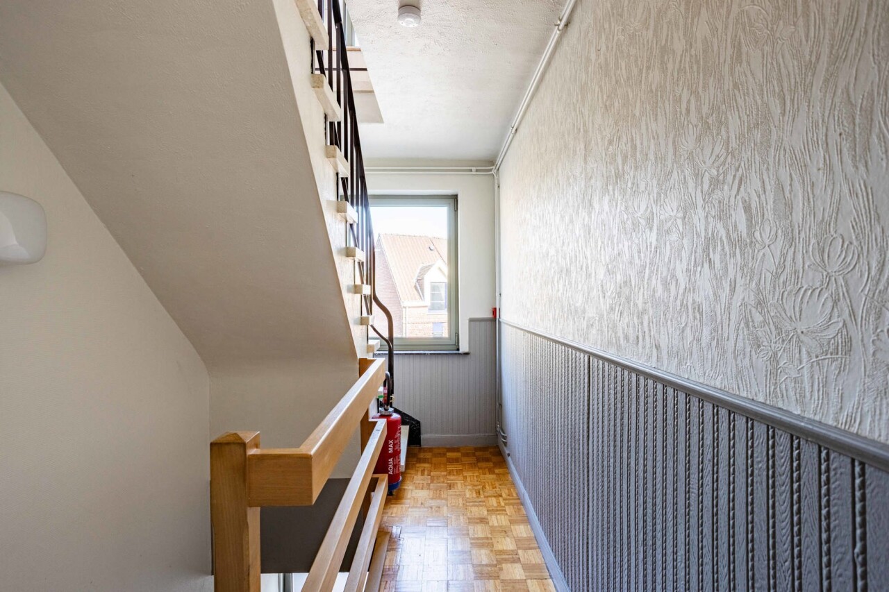 Het eerste verdiep omvat een instapklaar appartement van 63 m² met een lichtrijke woonkamer en een volledig vernieuwde open keuken voorzien van alle comfort. Verder beschikt het appartement over een badkamer met douche en toilet, een bergruimte/wasplaats en een ruime slaapkamer (12 m²) met balkon.