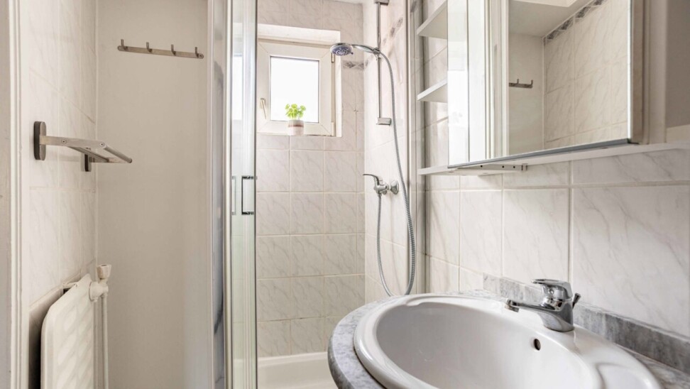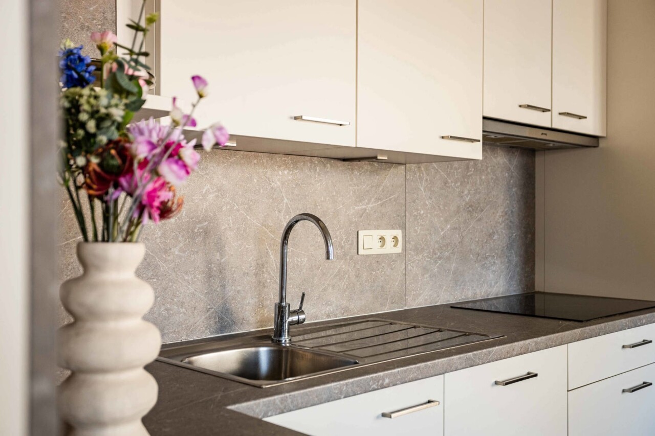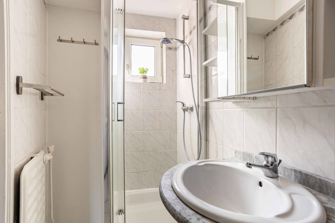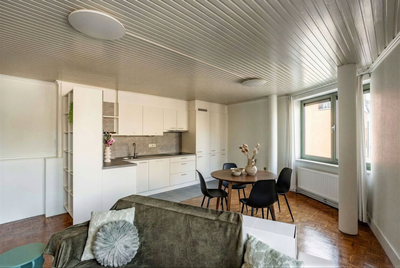 Het eerste verdiep omvat een instapklaar appartement van 63 m² met een lichtrijke woonkamer en een volledig vernieuwde open keuken voorzien van alle comfort. Verder beschikt het appartement over een badkamer met douche en toilet, een bergruimte/wasplaats en een ruime slaapkamer (12 m²) met balkon.