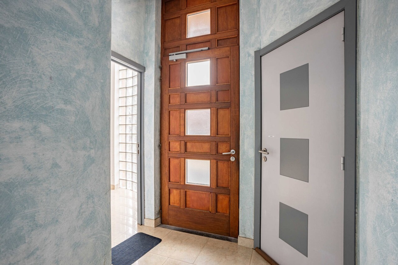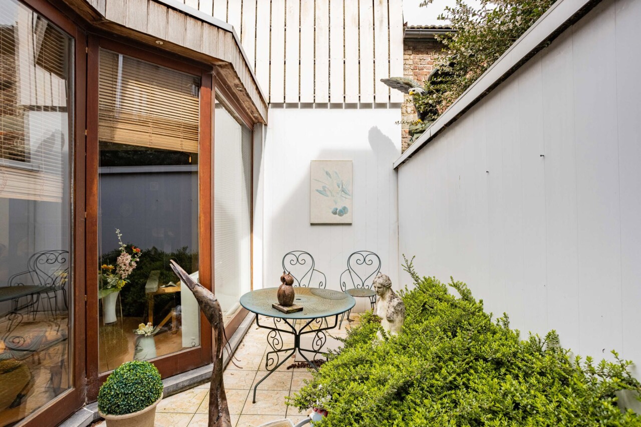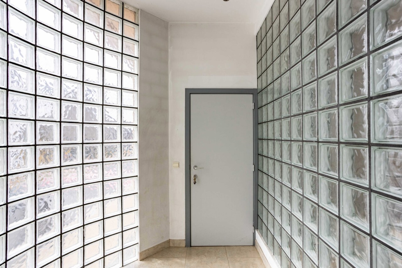 Het gebouw heeft een centrale inkomhal welke toegang geeft tot de 3 entiteiten. Het gelijkvloers appartement heeft een bruikbare oppervlakte van 110m², voorzien van een volledig uitgeruste en open keuken, één slaapkamer, bureauruimte en gezellig terras.