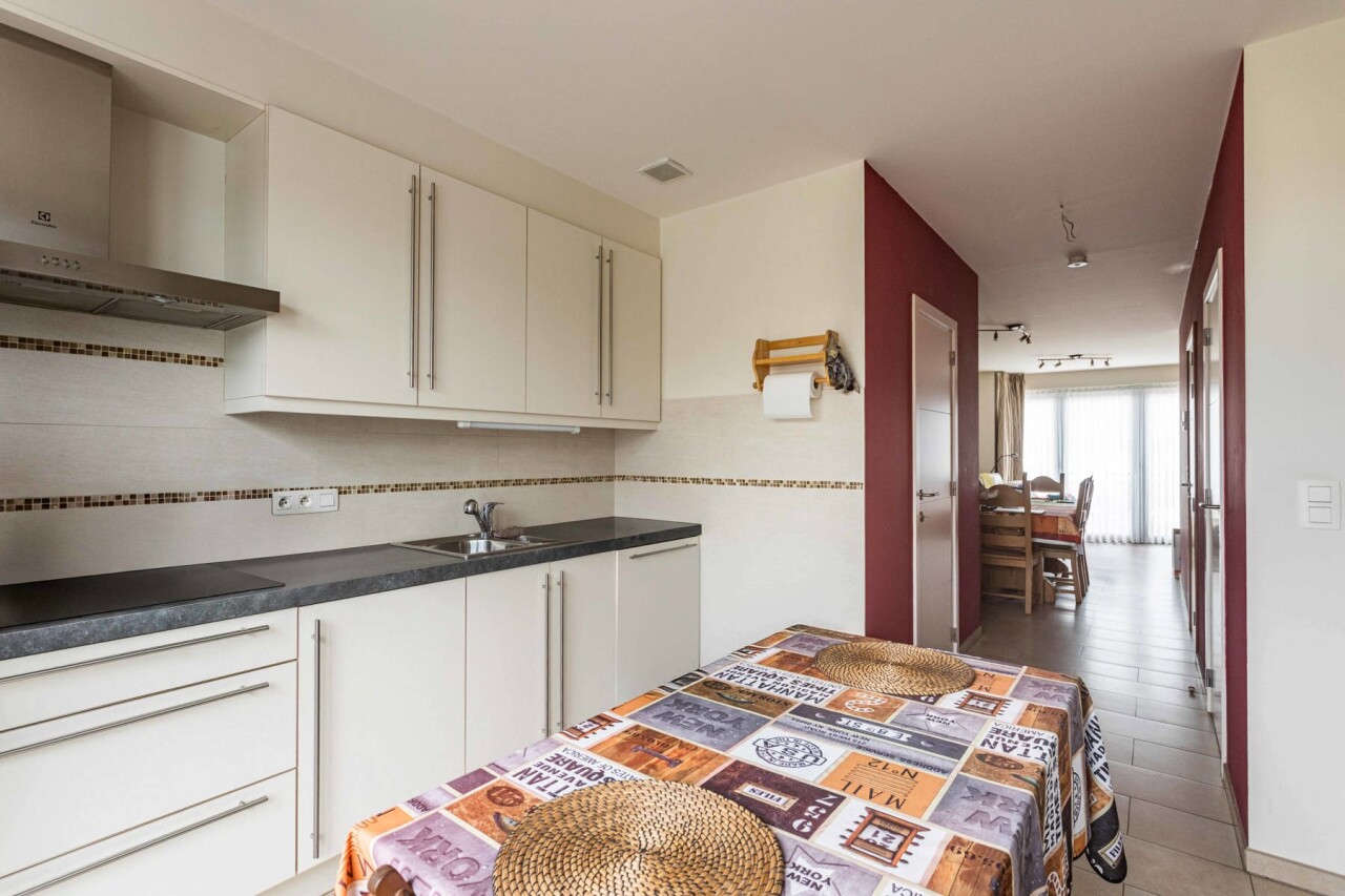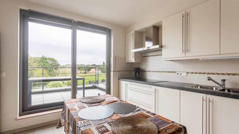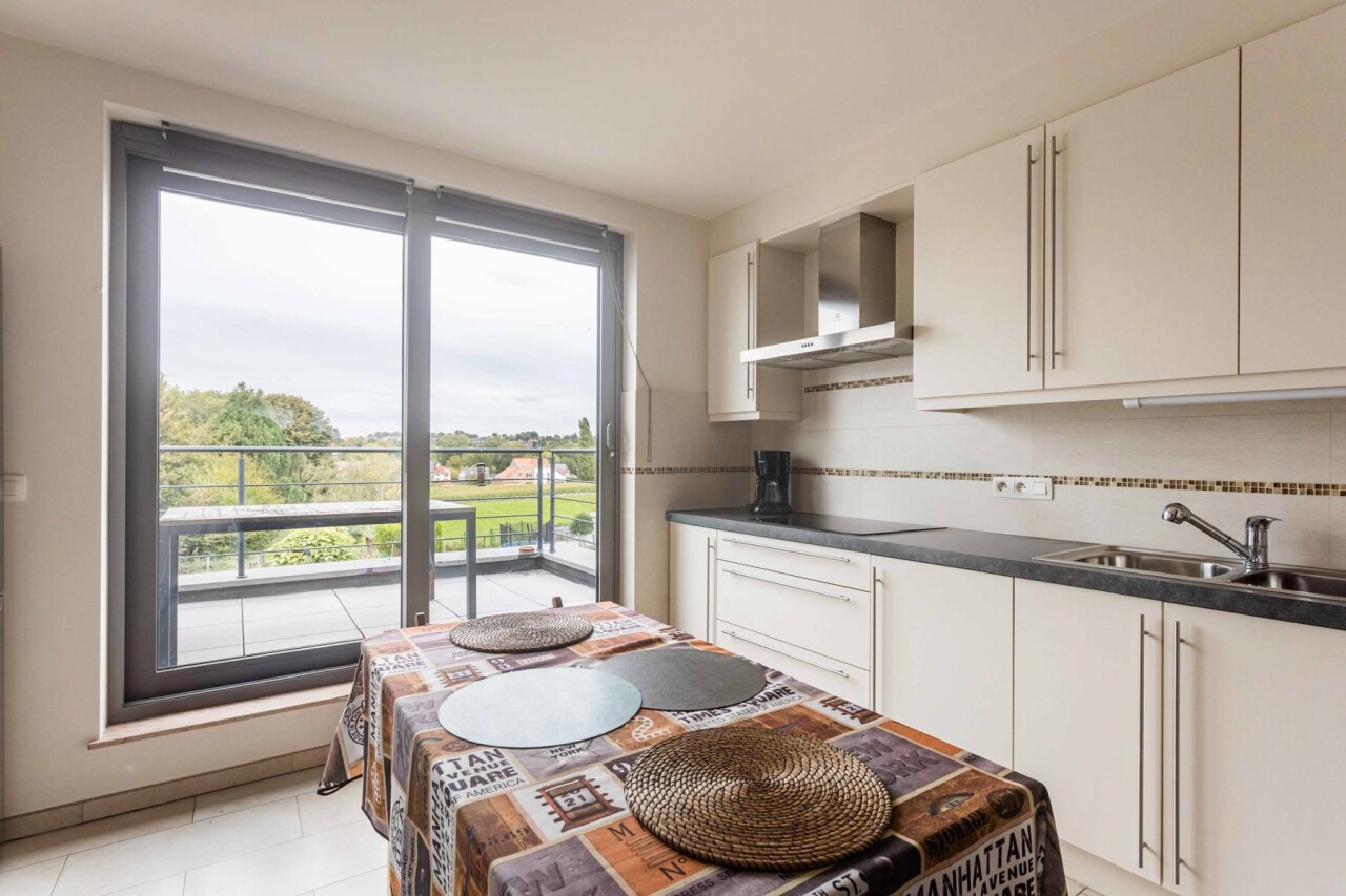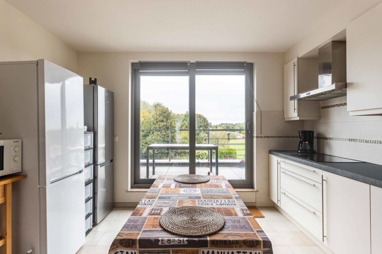 Op het eerste verdiep van het appartement vinden we de de ruime keuken dewelke voorzien werd van het nodige comfort. Vanuit de keuken hebben we toegang tot het terras aan de achterzijde van het gebouw. Hier kan men heerlijk genieten van een prachtig uitzicht over Dilbeek. Verder beschikt dit verdiep over een een gezellige woon - en eetkamer, gastentoilet en wasplaats/berging.