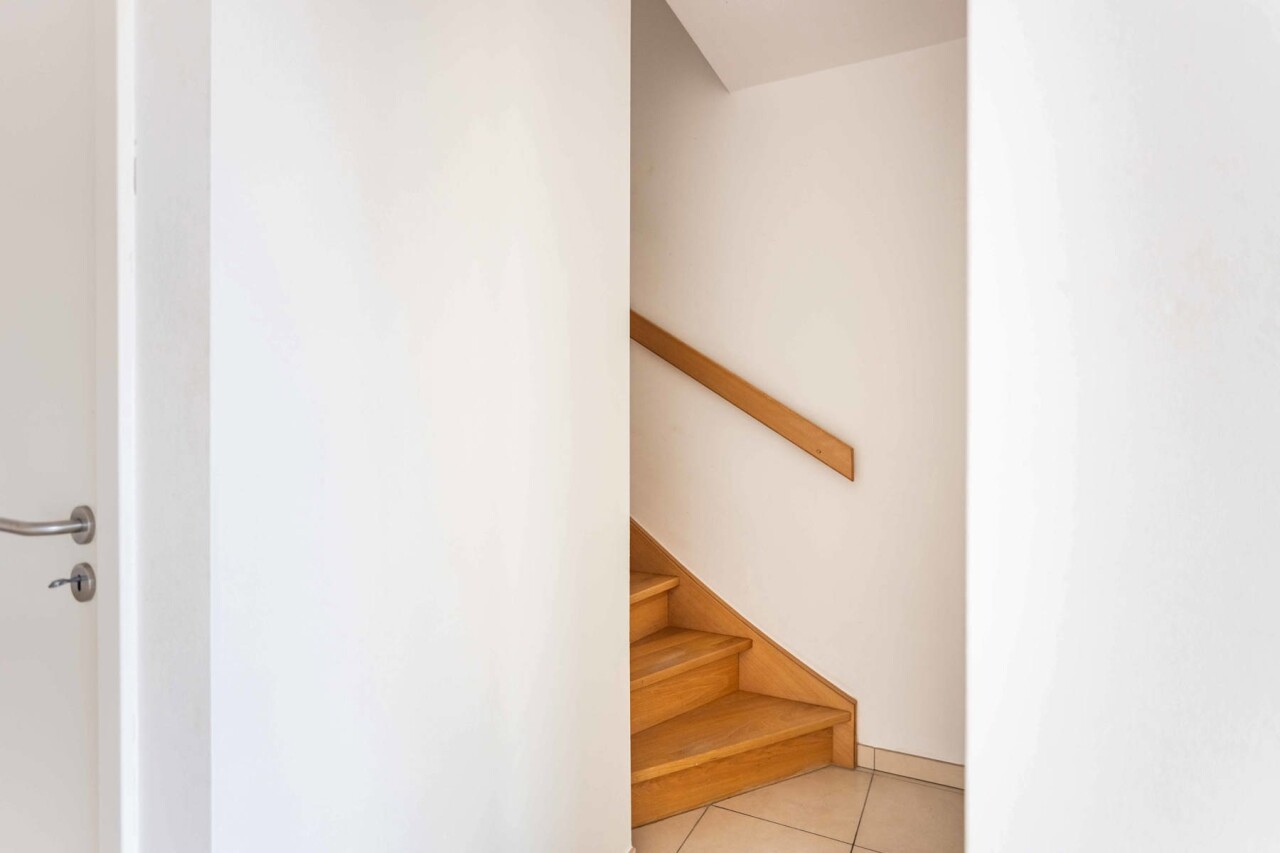We komen binnen in de inkomhal met gastentoilet en lopen door naar de lichtrijke woon- en eetkamer (27 m²) met grote raampartijen aan de voorzijde. De open keuken is uitgerust met alle comfort (behalve vaatwasmachine) en geeft, net als de woonkamer, directe toegang tot het terras. Op het gelijkvloers is ook nog een handige berging onder de trap.