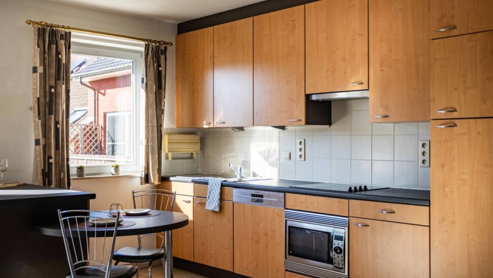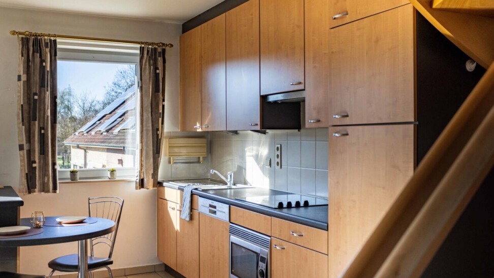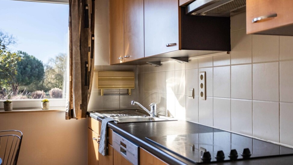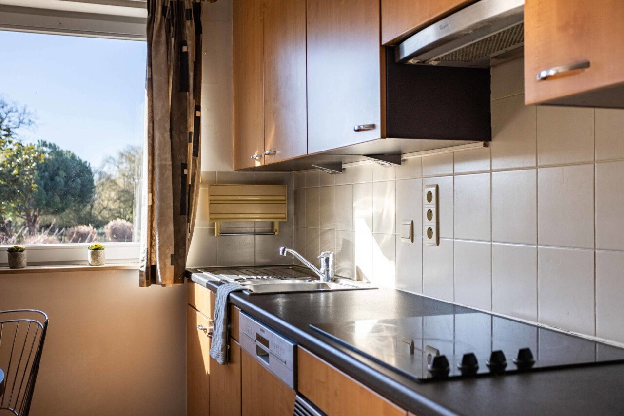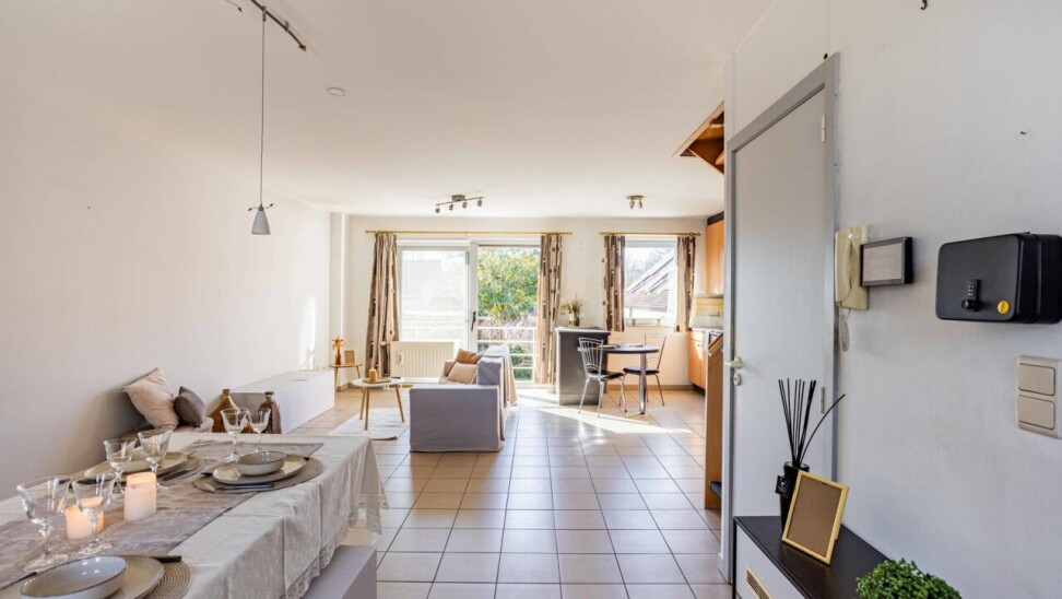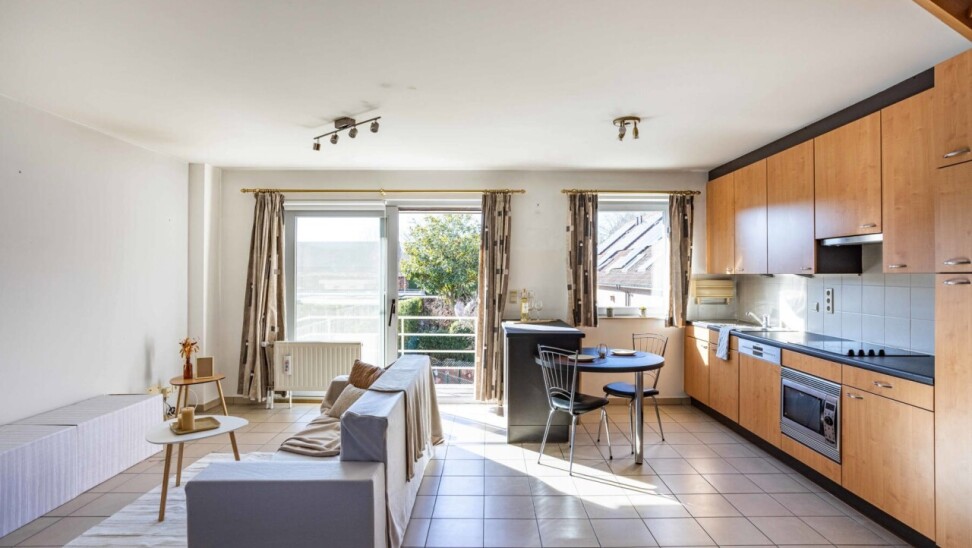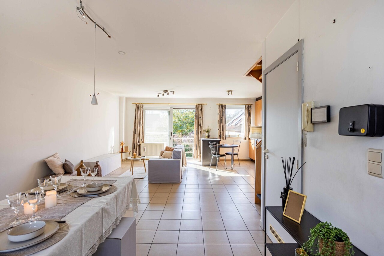 We betreden het appartement via een inkomhal met apart gastentoilet en praktische berging. Vanuit de inkomhal komen we in de ruime woon- en eetkamer (36 m²) met open keuken. Dankzij de grote raampartijen en het gezellige terras aan de achterzijde van het appartement geniet de leefruimte van een overvloed aan natuurlijk licht. De open keuken is uitgerust met het nodige basiscomfort.