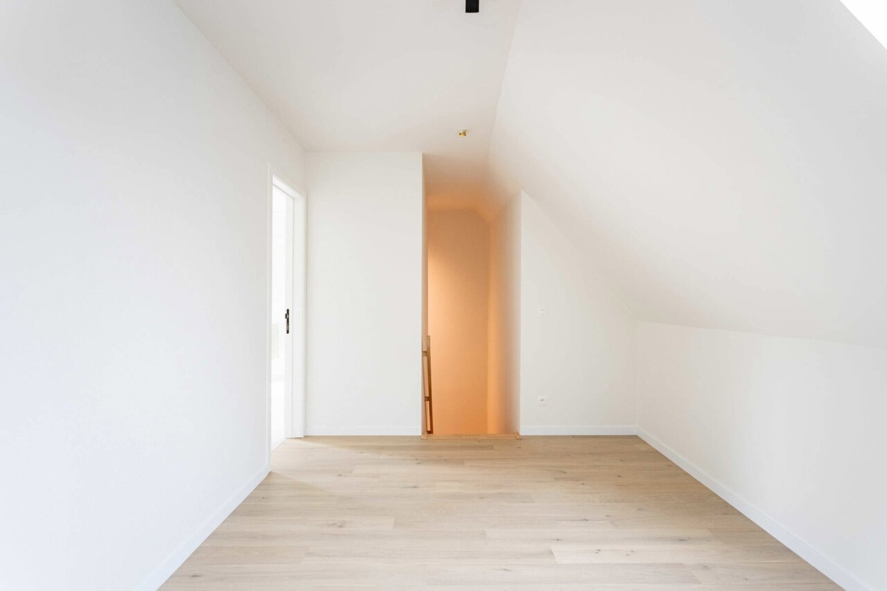 Op de eerste verdieping vindt u een zeer ruime badkamer met inloopdouche en twee volwaardige slaapkamers, waarvan de grootste is uitgerust met prachtige ingemaakte kasten. De nachthal is bovendien ruim genoeg voor het inrichten van een bureau of zithoek.