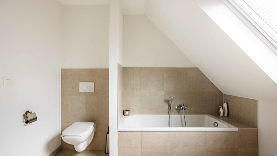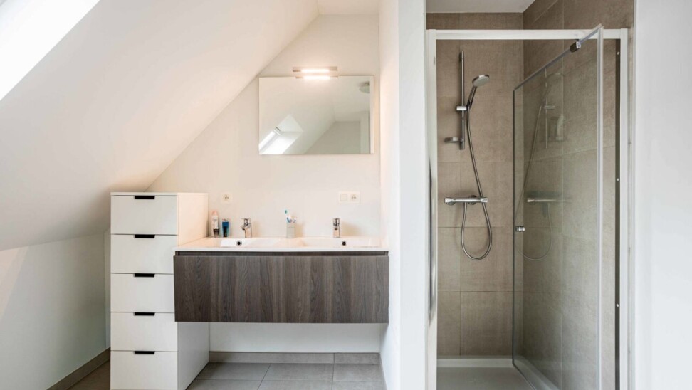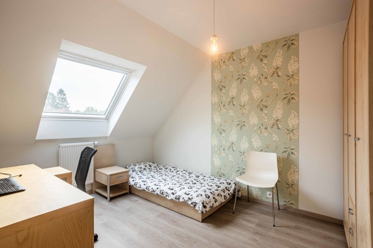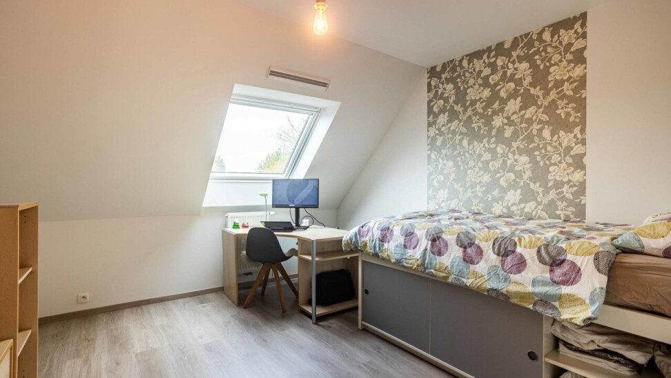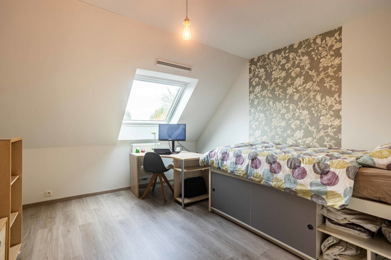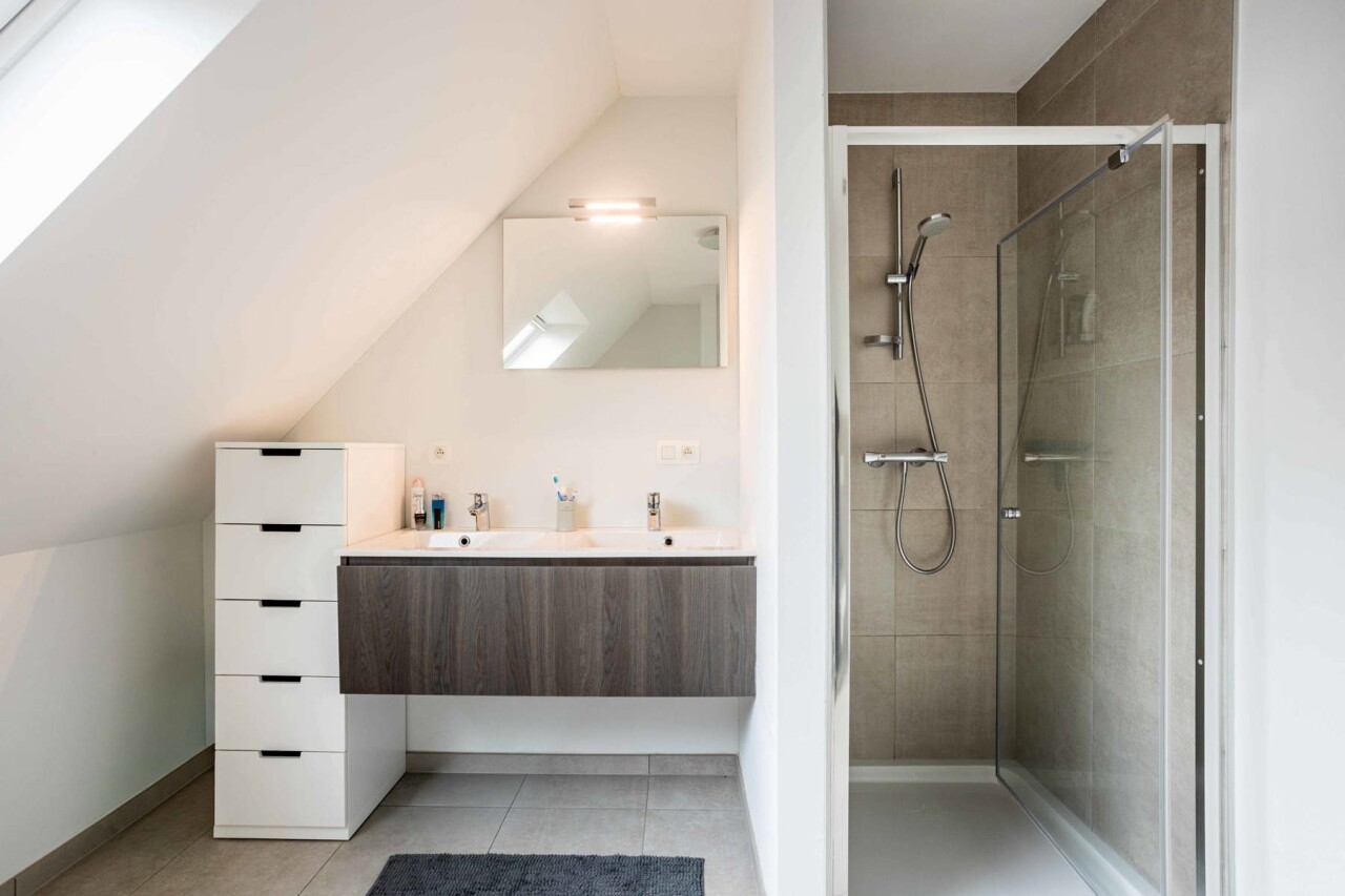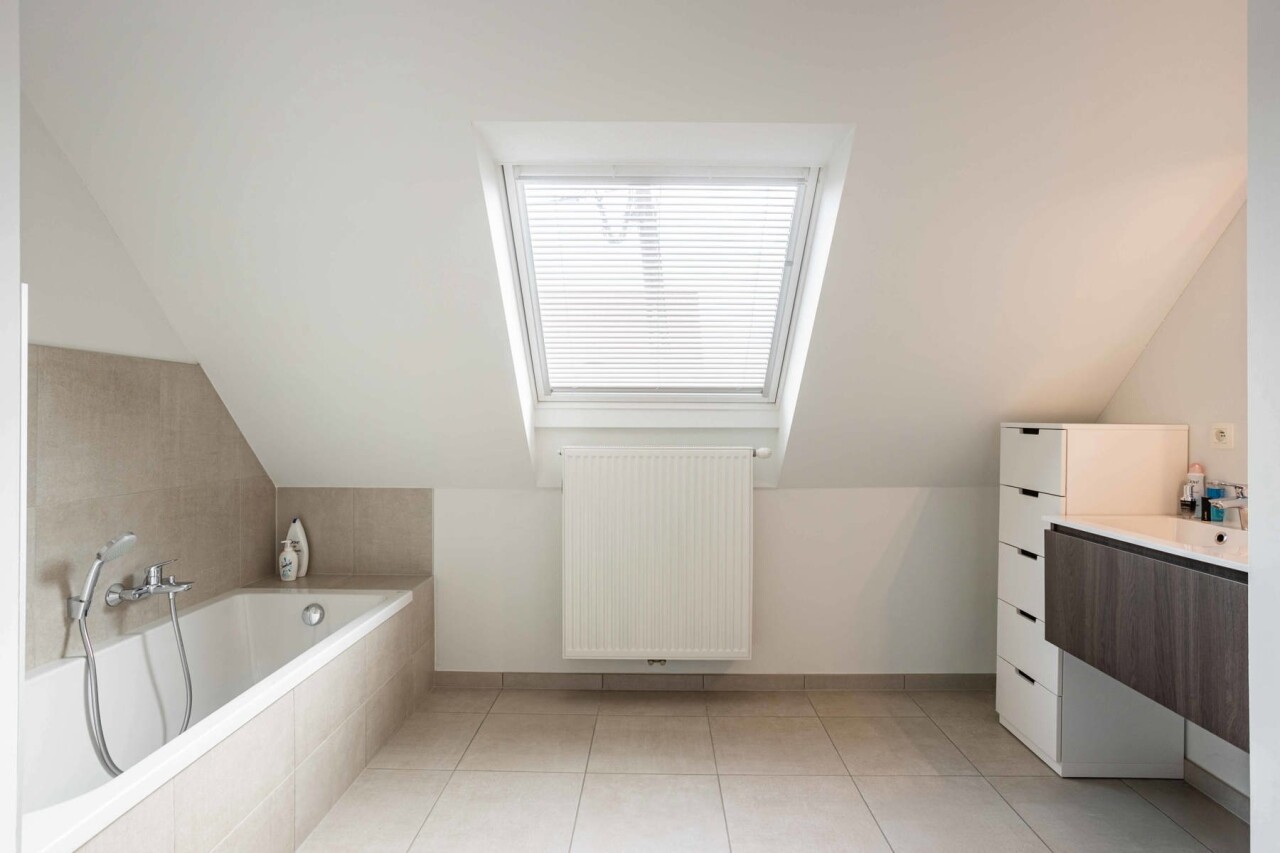 Op het eerste verdiep vinden we 3 ruime slaapkamers (13,5m²-14m²-12m²) en een badkamer met douche, ligbad en toilet.
