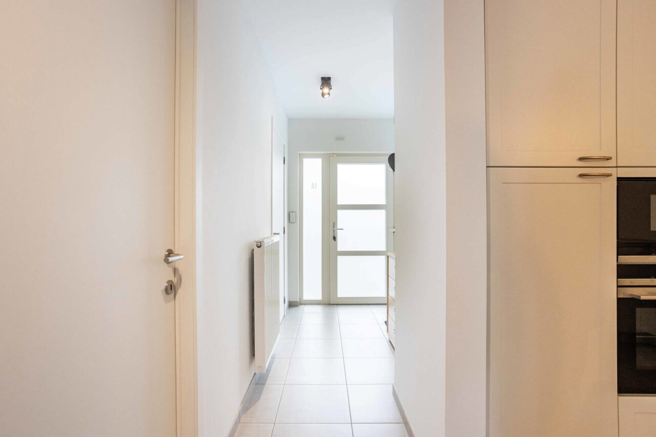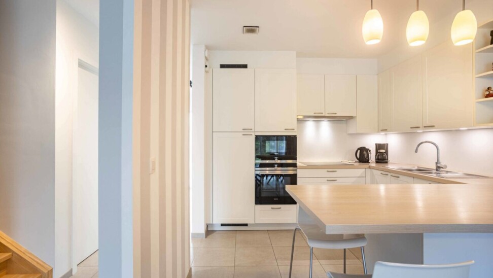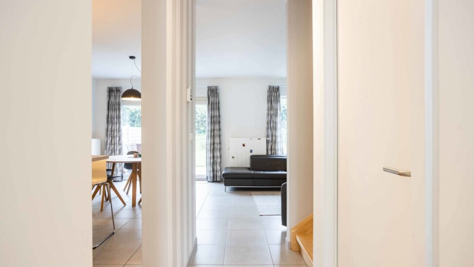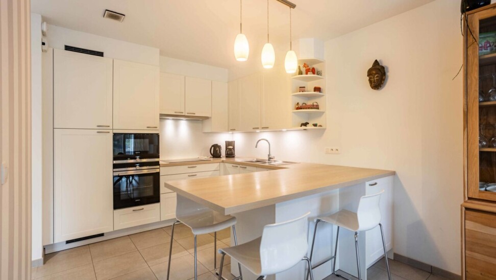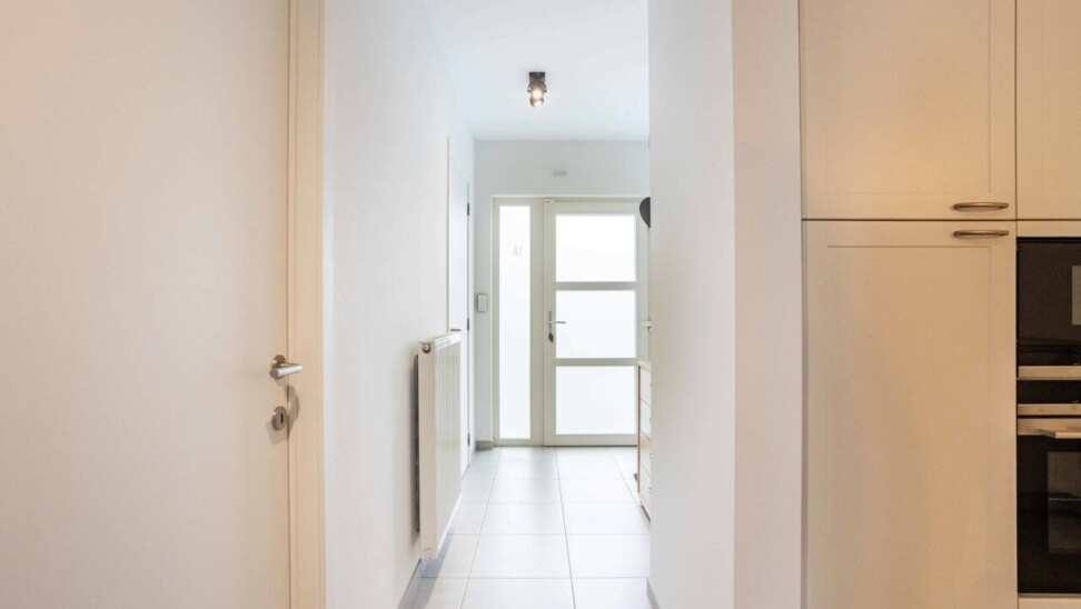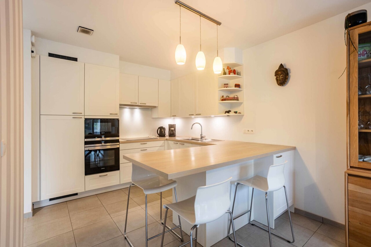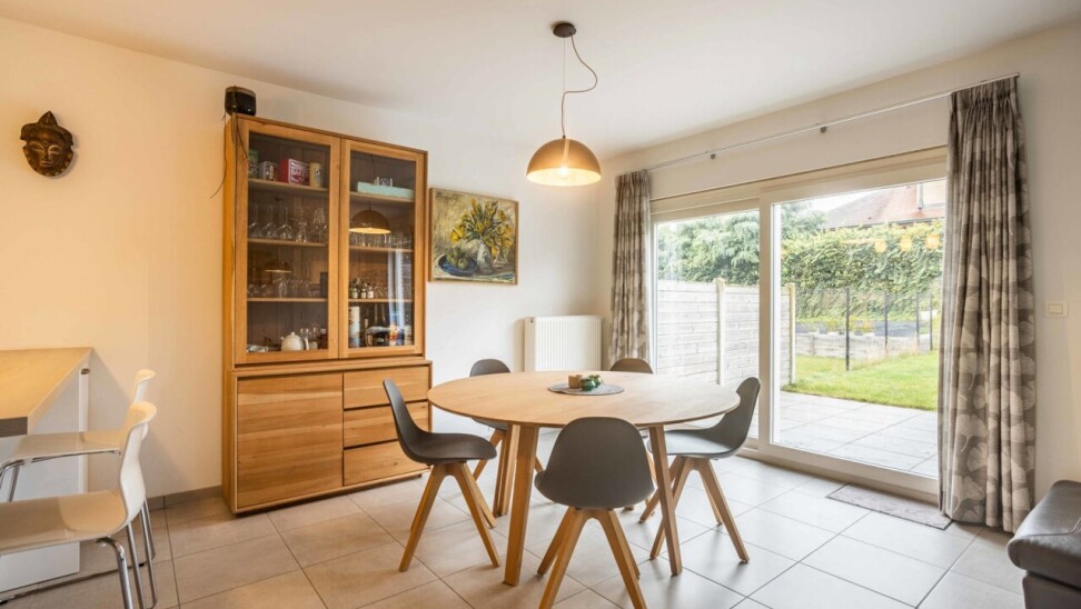 We komen binnen in de hal met apart toilet en grote berging met aparte ingang langs de voorzijde, ideaal om te gebruiken als vestiaire, fietsenstalling, kinderwagens, ...Iets verder vinden we ook nog een grote wasplaats/extra bergruimte. De woon- en eetkamer (29m²) bevinden zich naast de moderne, open keuken die volledig uitgerust is en zeer praktisch ingedeeld werd. Door de grote raampartijen, die een directe toegang geven tot het terras en de tuinzone, is het gezellig vertoeven in deze open ruimte.