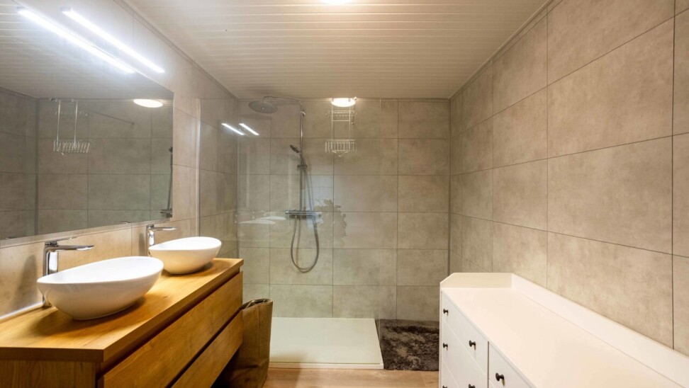 Op het eerste verdiep vinden we drie slaapkamers ( 22-19 en 9m²) en een vernieuwde badkamer met inloopdouche, dubbele lavabo en toilet.