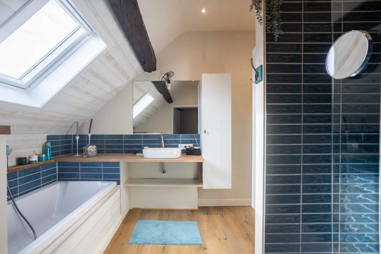 Op het eerste verdiep vinden we de volledige vernieuwde badkamer met douche, ligbad en toilet, 4 slaapkamers ( 12-13-14-26m²) en een grote kamer van bijna 40m². Dewelke perfect ingericht kan worden als een volwaardige studio met aparte ingang.