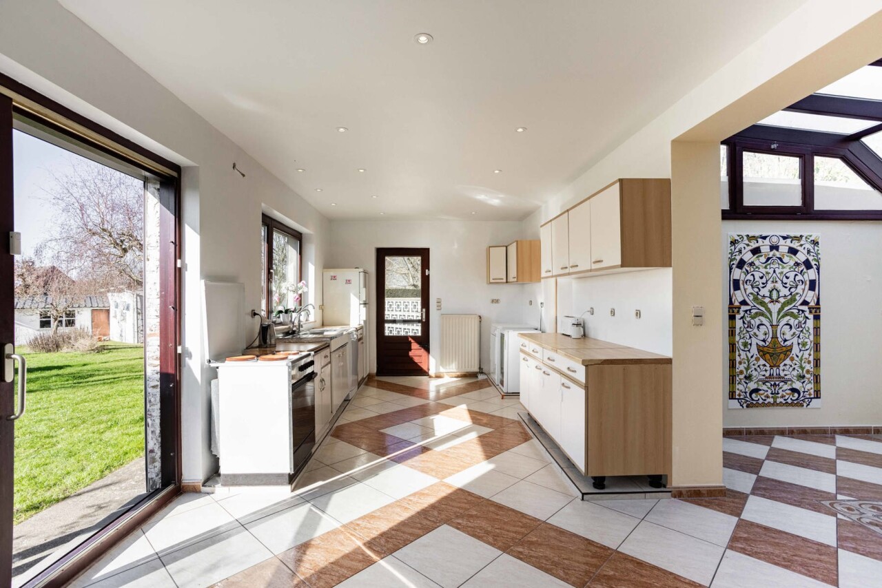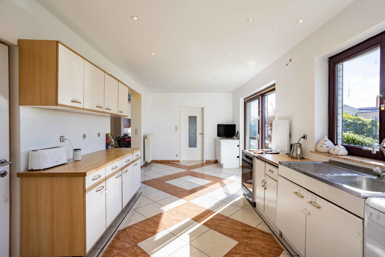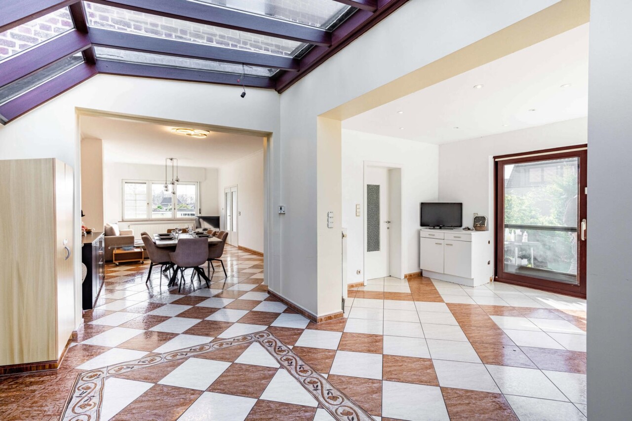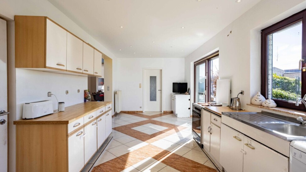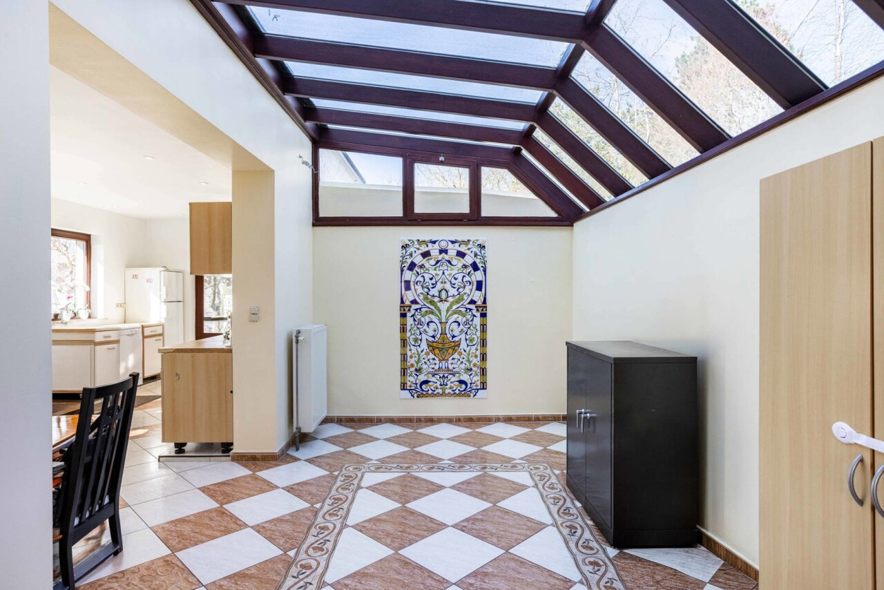 De charmante woning verwelkomt ons via een ruime inkomhal met apart gastentoilet, die ons leidt naar het hart van de woning: de royale leefkeuken. Hoewel de keuken aan vernieuwing toe is, biedt deze dankzij haar ruime oppervlakte bijzonder veel potentieel en een mooi zicht op de verzorgde tuin. Aansluitend bevindt zich de lichtrijke woonkamer, die geniet van een aangename natuurlijke lichtinval dankzij de grote raampartijen en het gedeeltelijk glazen plafond.