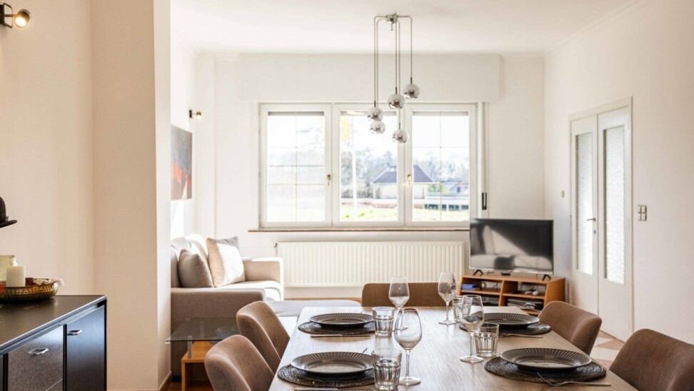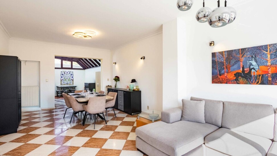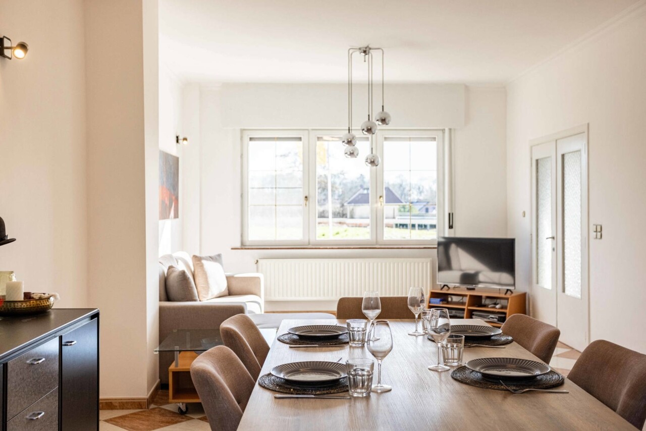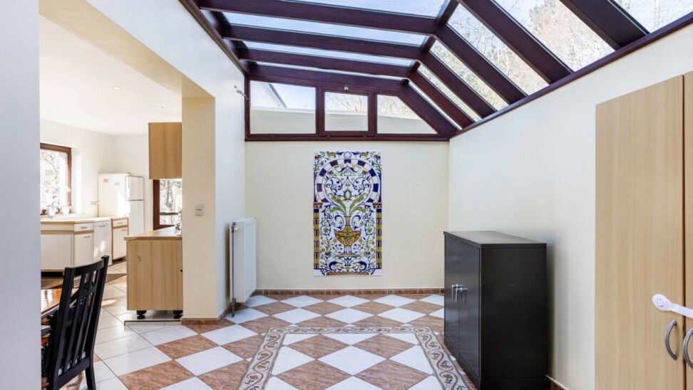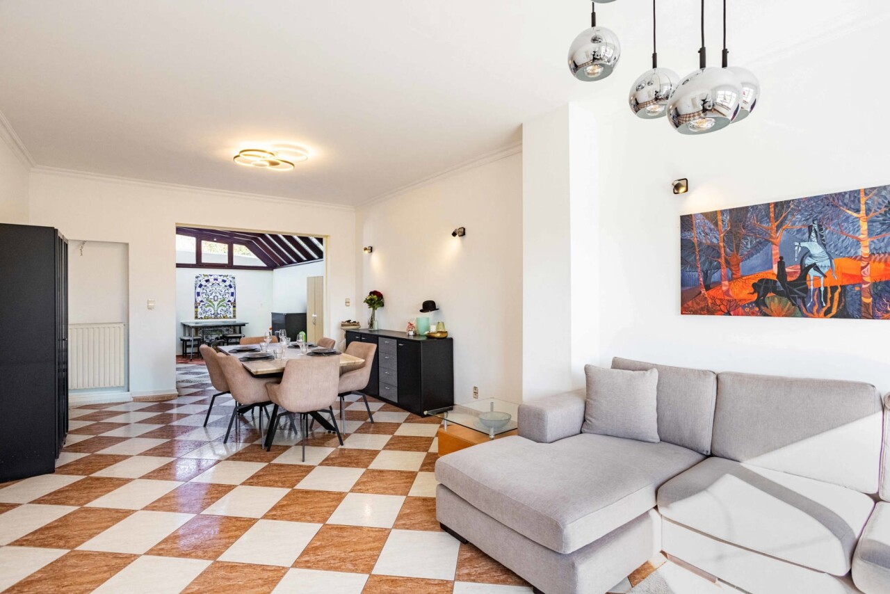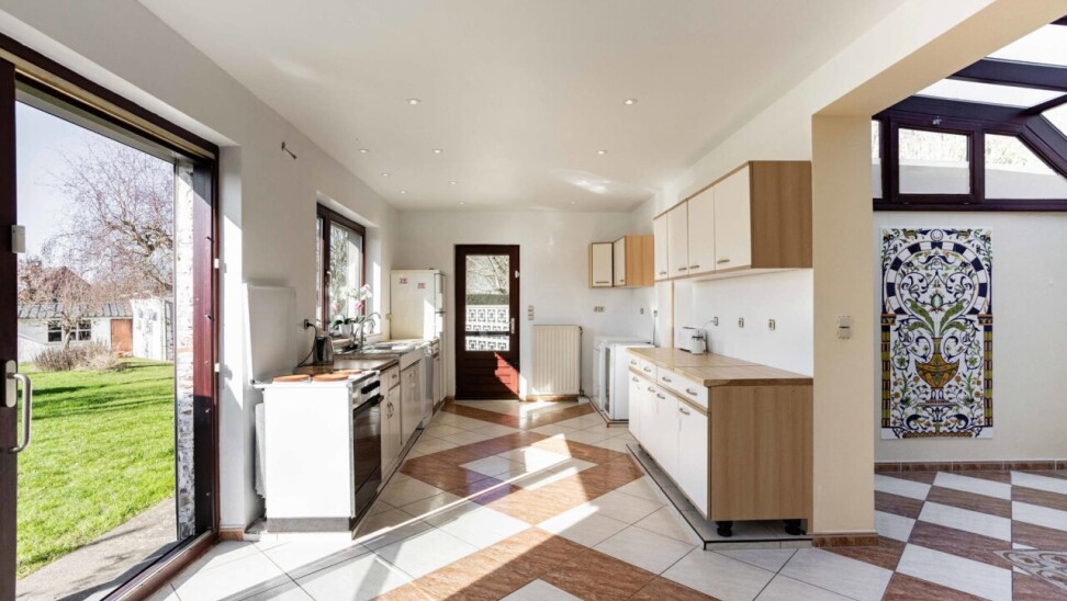 De charmante woning verwelkomt ons via een ruime inkomhal met apart gastentoilet, die ons leidt naar het hart van de woning: de royale leefkeuken. Hoewel de keuken aan vernieuwing toe is, biedt deze dankzij haar ruime oppervlakte bijzonder veel potentieel en een mooi zicht op de verzorgde tuin. Aansluitend bevindt zich de lichtrijke woonkamer, die geniet van een aangename natuurlijke lichtinval dankzij de grote raampartijen en het gedeeltelijk glazen plafond.