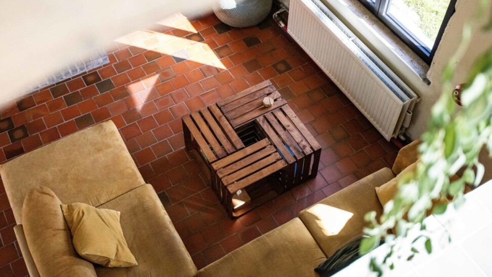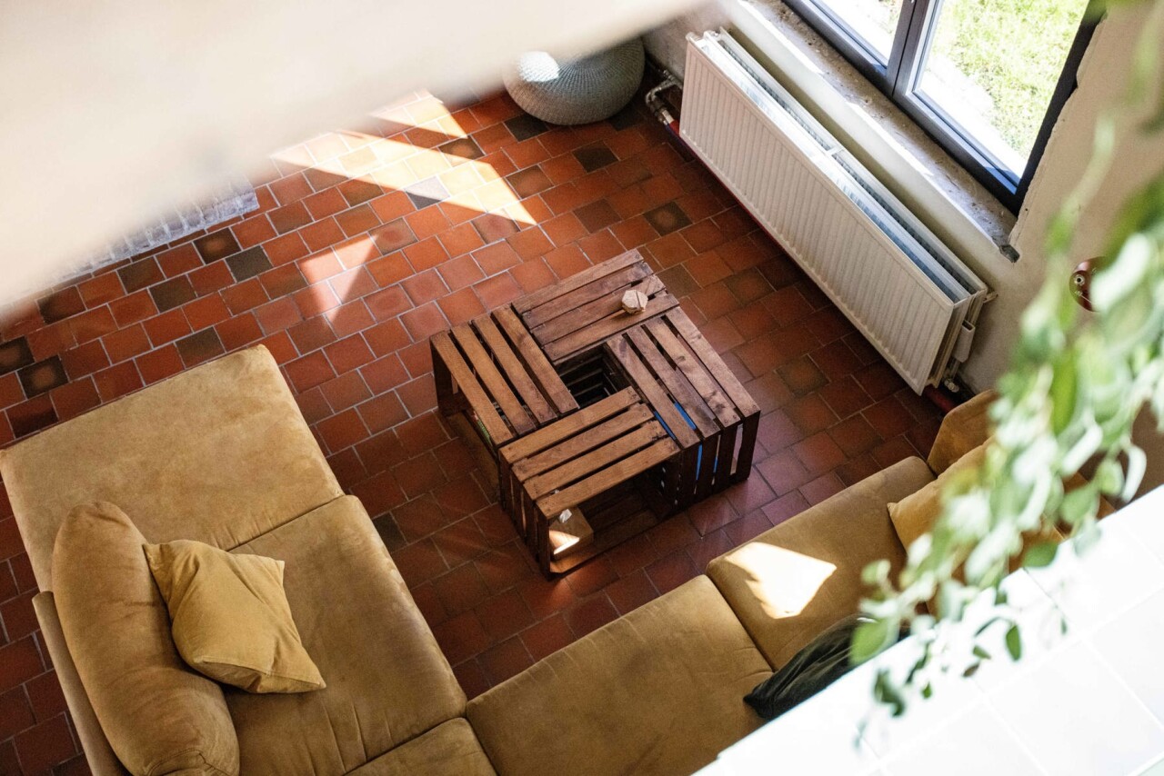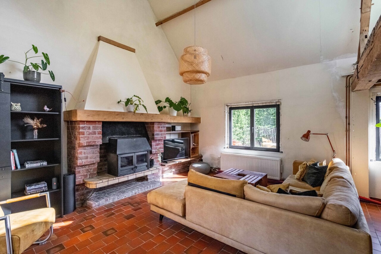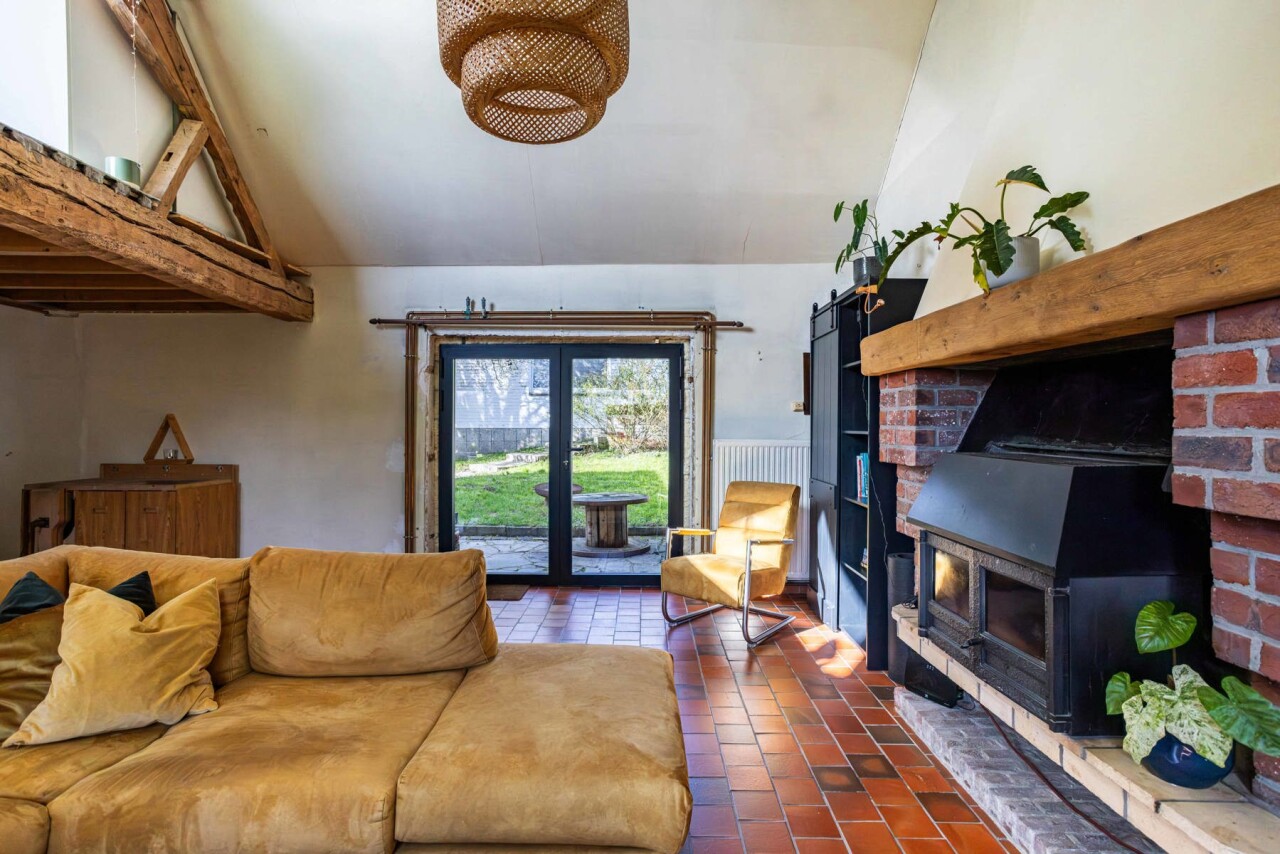 Binnen worden we verwelkomd in een sfeervolle woonkamer (42 m²) met heel wat authentieke elementen. Dankzij de directe toegang tot het terras en de tuinzone vloeien binnen- en buitenleven hier naadloos in elkaar over.