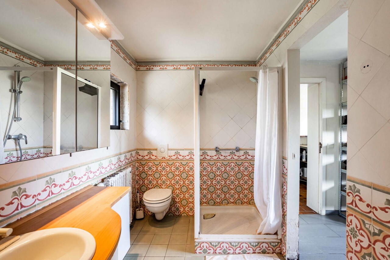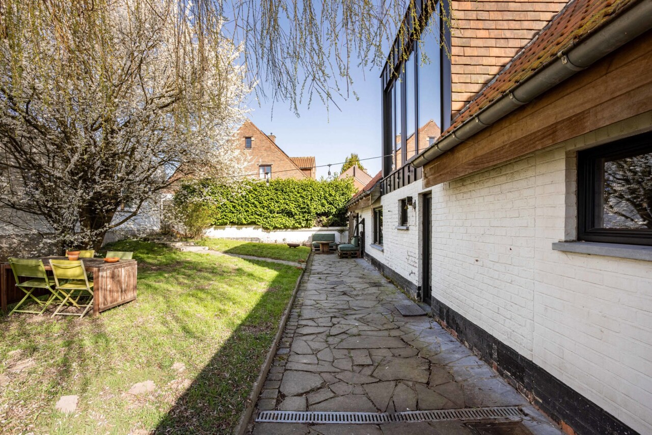 De eerste verdieping werd volledig gerenoveerd en vormt vandaag het hart van de woning. De raampartijen zorgen hier voor een overvloed aan natuurlijk licht en bieden een adembenemend uitzicht op het omliggende groen. De stijlvolle keuken (24 m²) is uitgerust met alle hedendaagse comfort en beschikt over een elegant keukeneiland. Aansluitend bevindt zich een ruime eetplaats met een prachtig zicht op de tuin. Op dit verdiep vinden we tevens een comfortabele slaapkamer van 21 m².