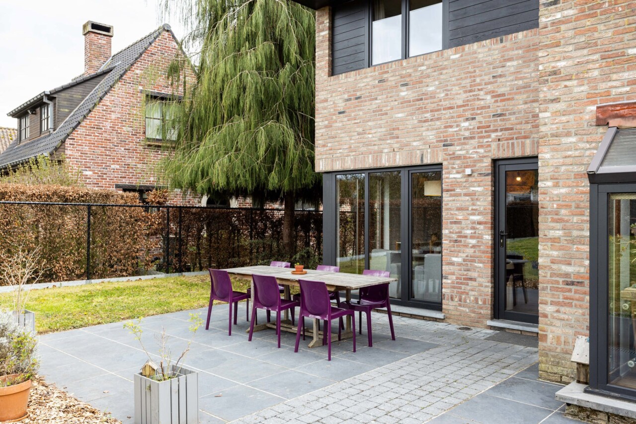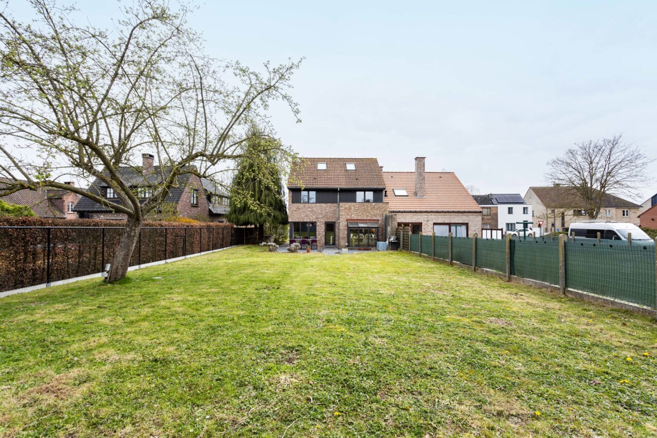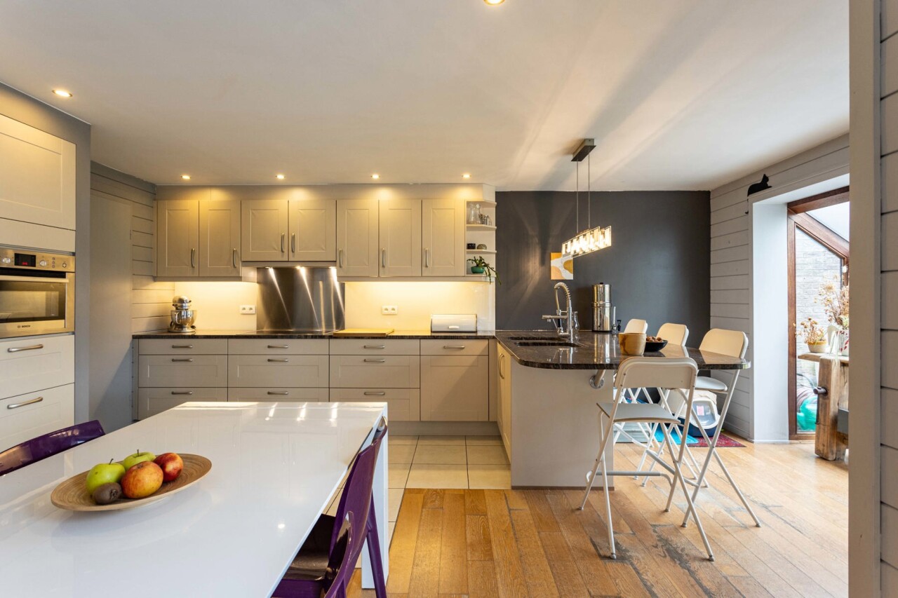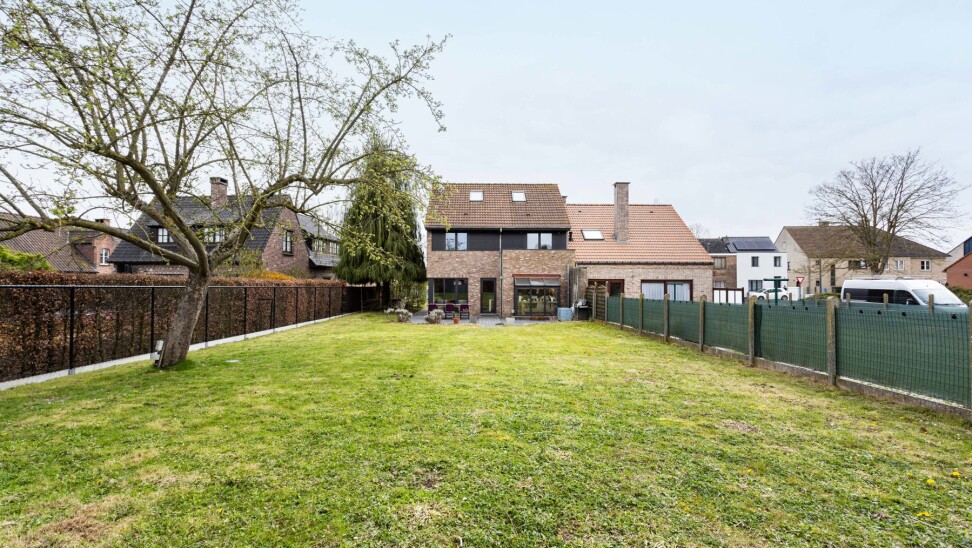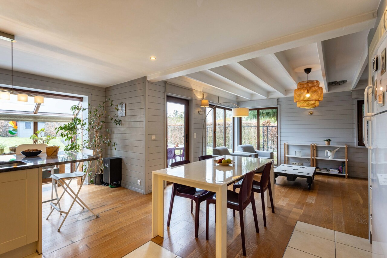 We komen binnen in een ruime inkomhal met gastentoilet. De inkomhal begeleidt ons naar de lichtrijke woonkamer met open keuken. De keuken is voorzien van alle comfort en geniet van een mooi zicht op de woon - en eetkamer. De gehele gelijksvloer geniet van heel wat lichtinval door de grote raampartijen aan de achterzijde, dewelke ook meteen zorgen voor een prachtig zicht over het terras en de tuin.