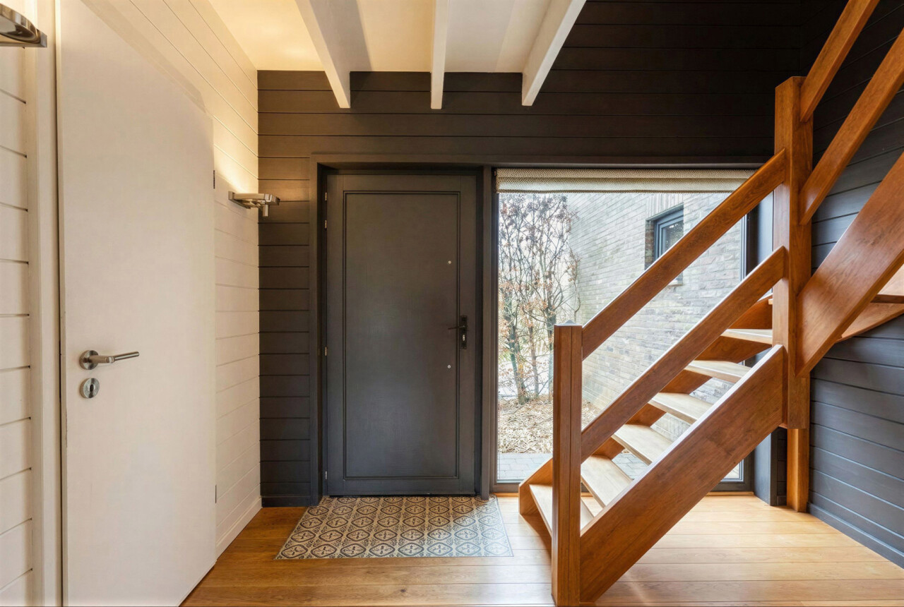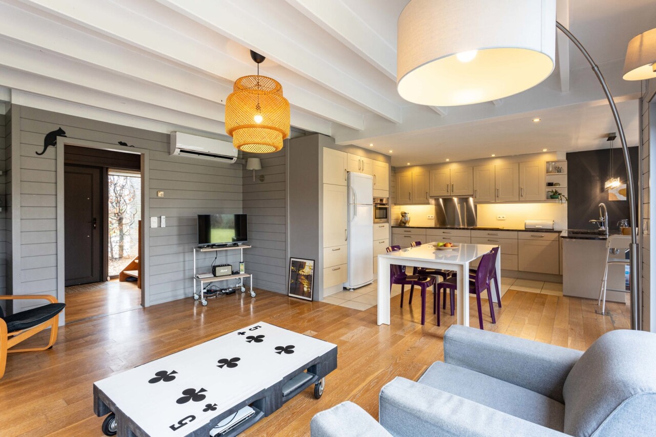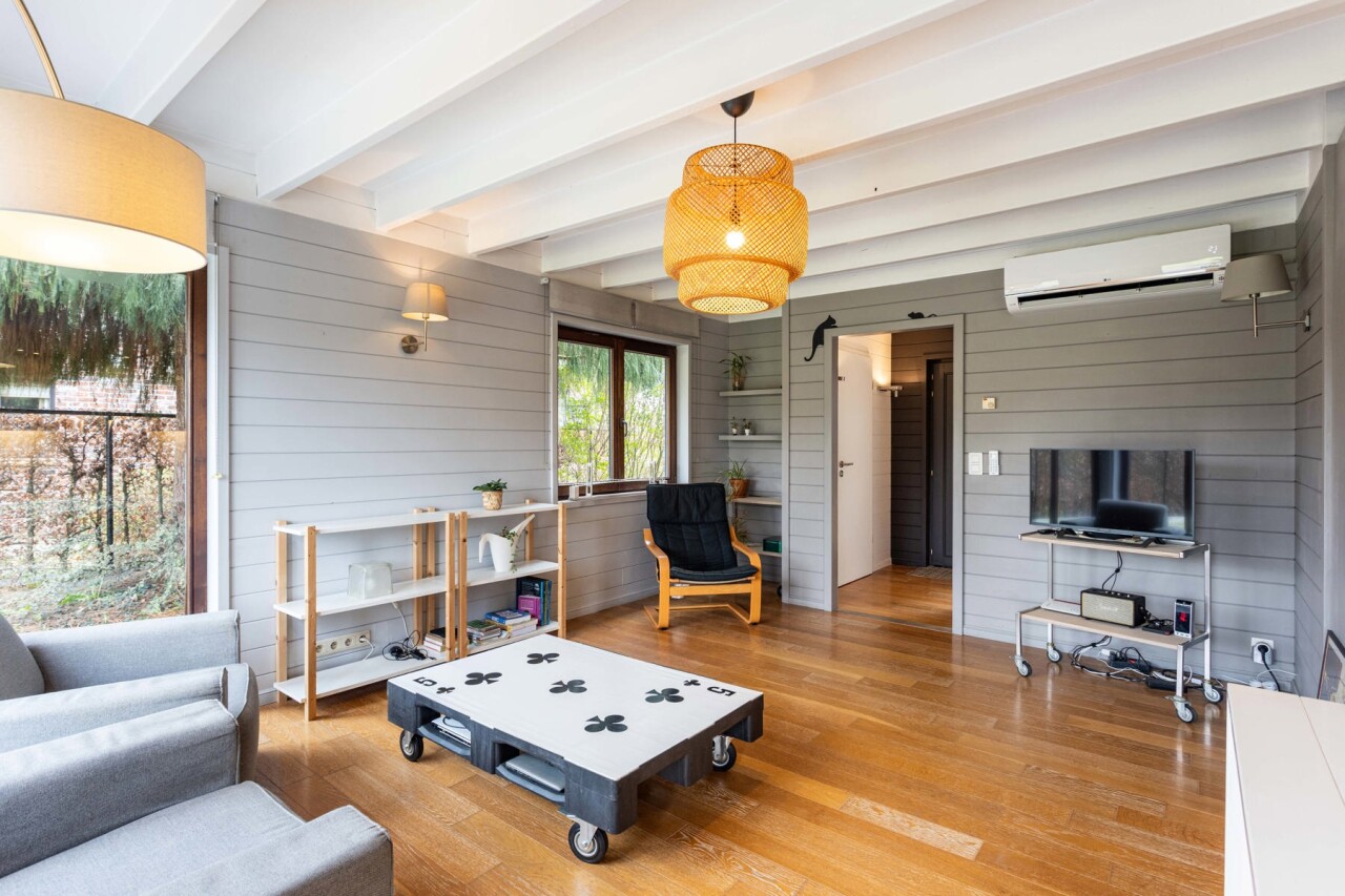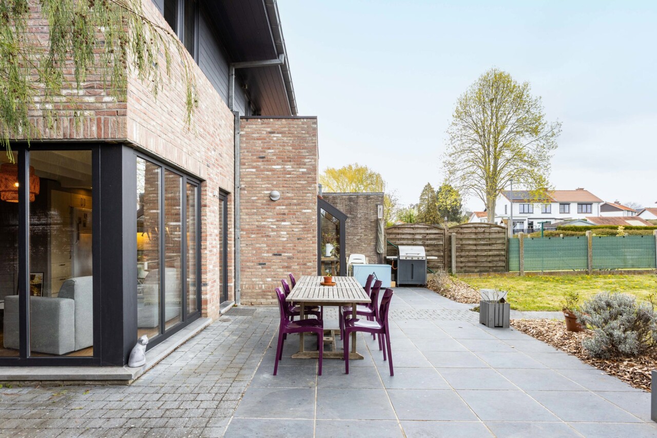 We komen binnen in een ruime inkomhal met gastentoilet. De inkomhal begeleidt ons naar de lichtrijke woonkamer met open keuken. De keuken is voorzien van alle comfort en geniet van een mooi zicht op de woon - en eetkamer. De gehele gelijksvloer geniet van heel wat lichtinval door de grote raampartijen aan de achterzijde, dewelke ook meteen zorgen voor een prachtig zicht over het terras en de tuin.