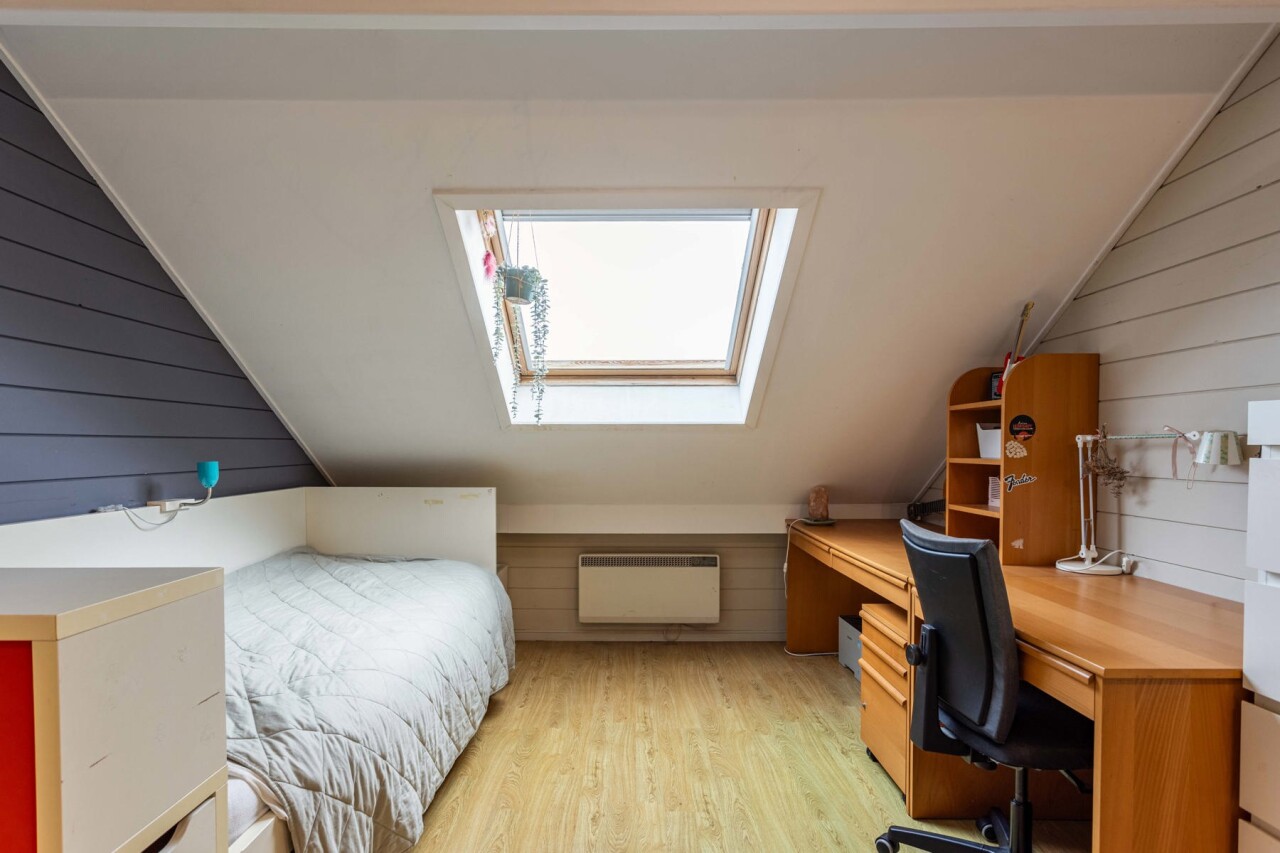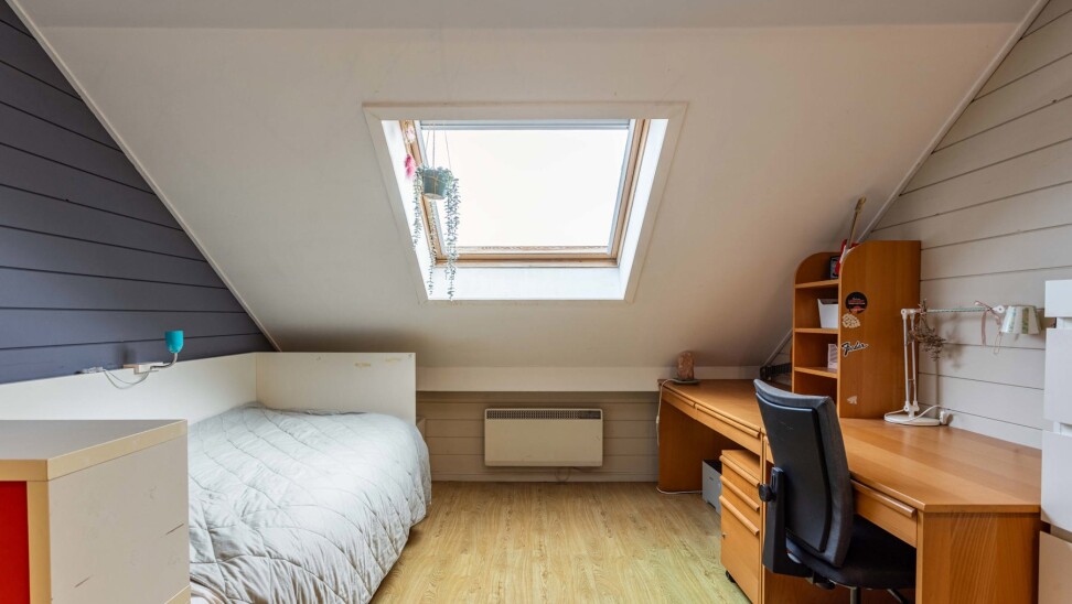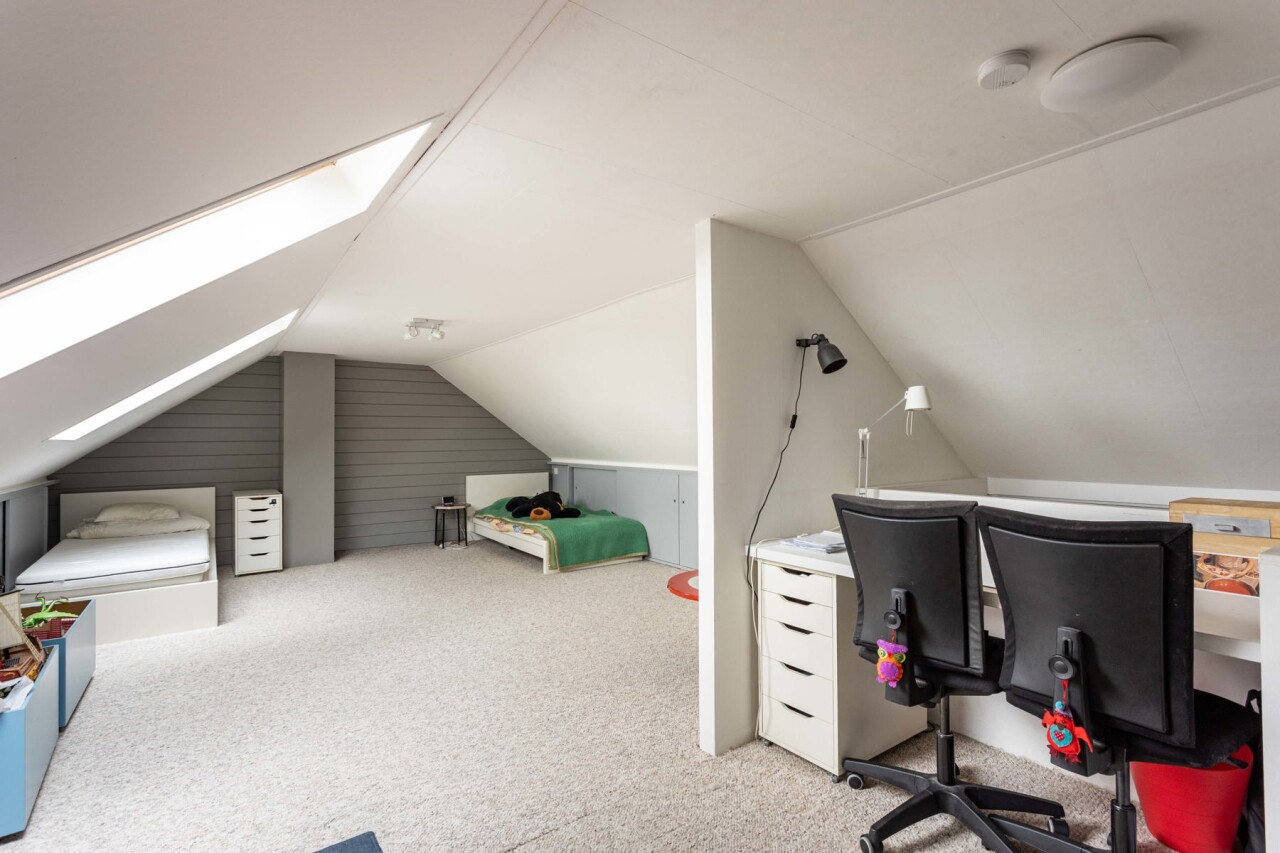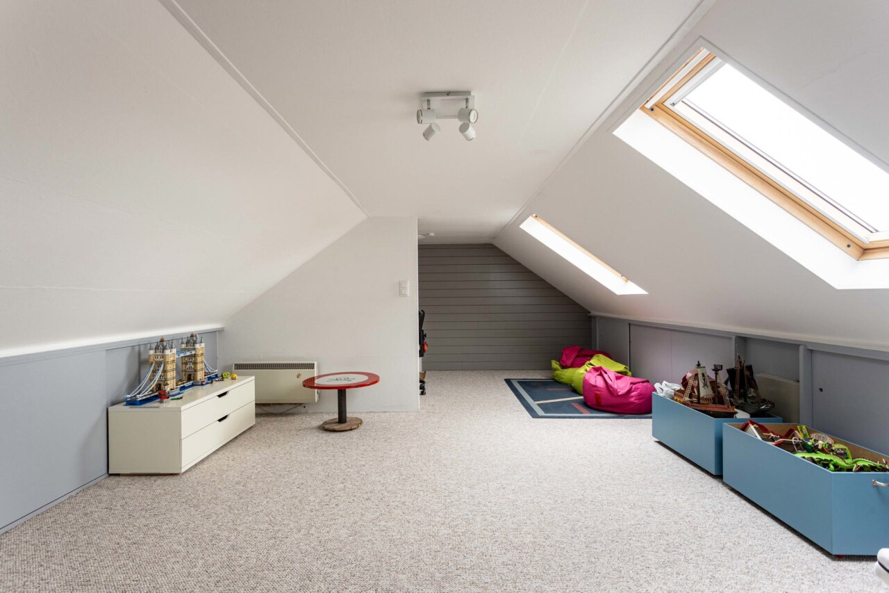 De zolderverdieding (35m²) wordt momenteel ingericht als grote slaapkamer en bureauruimte.