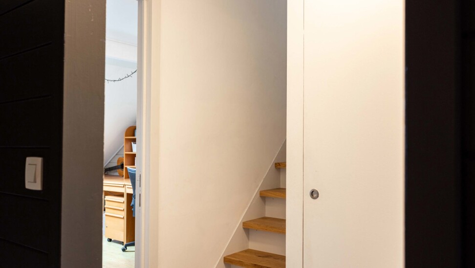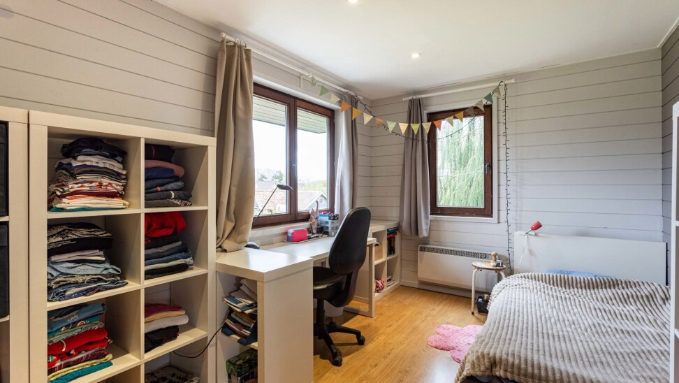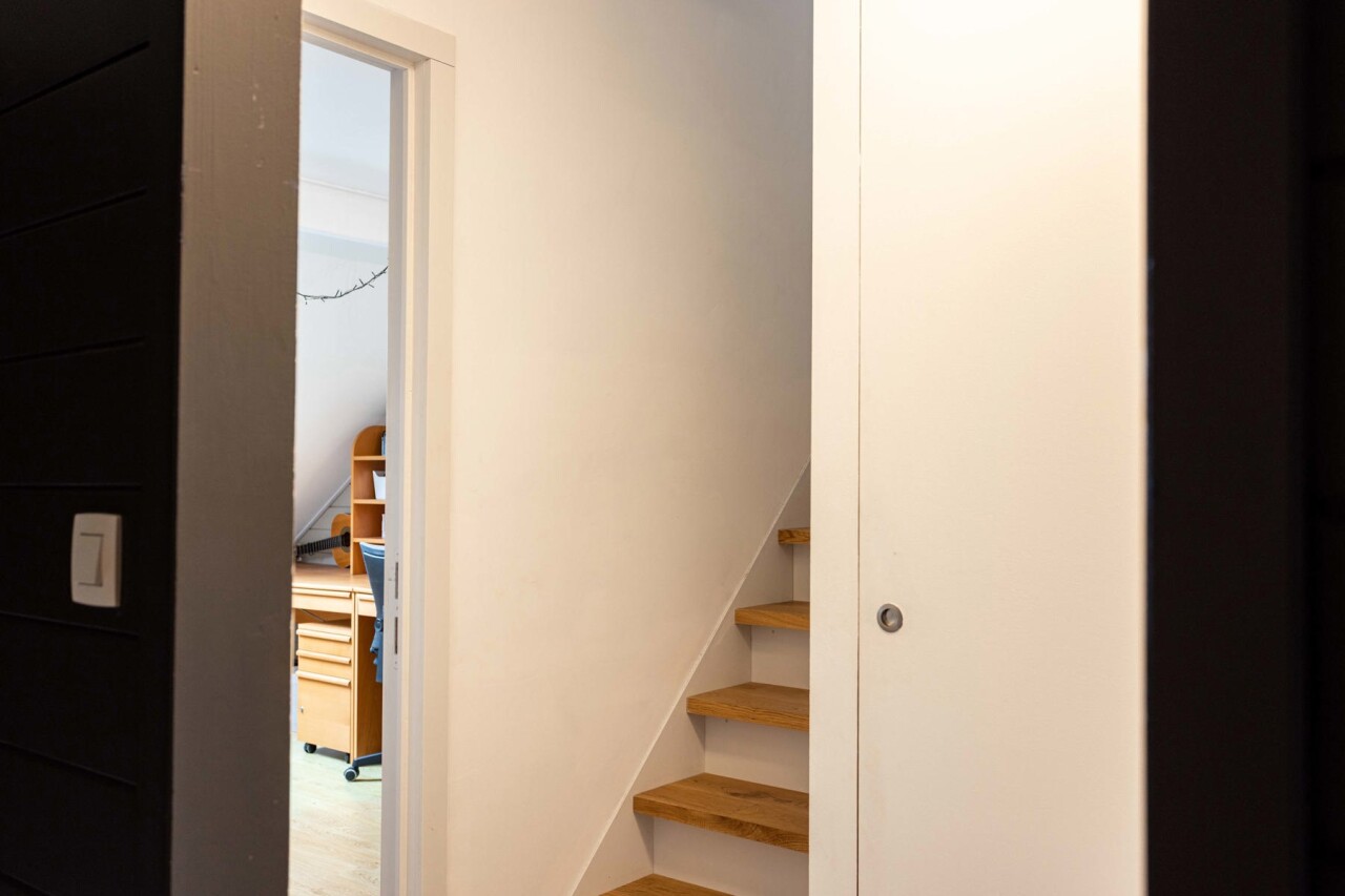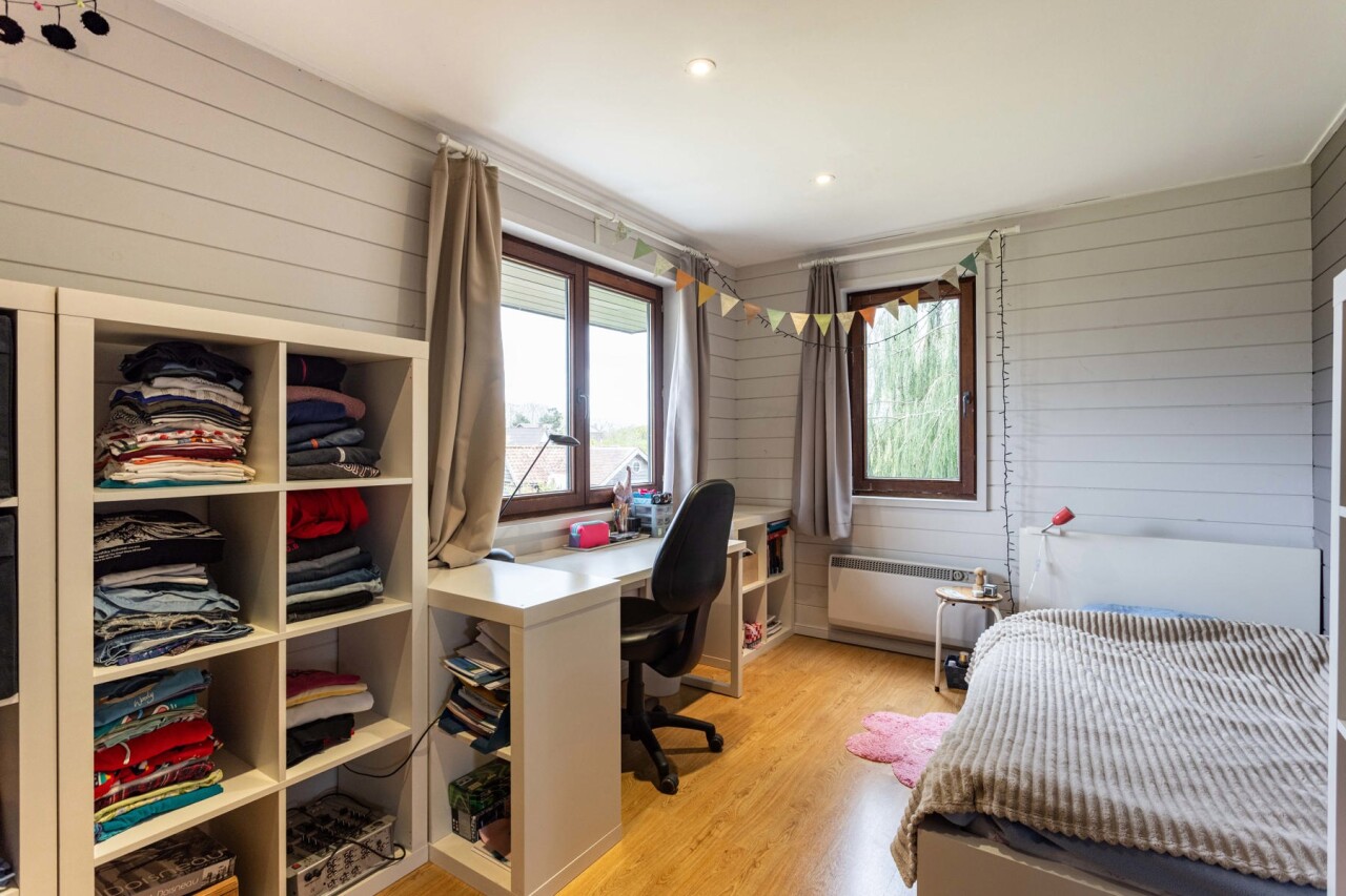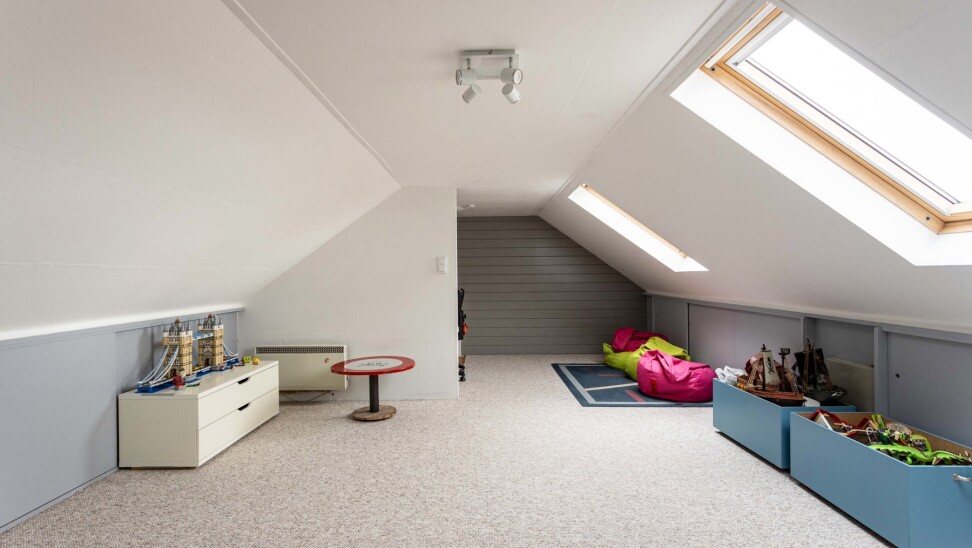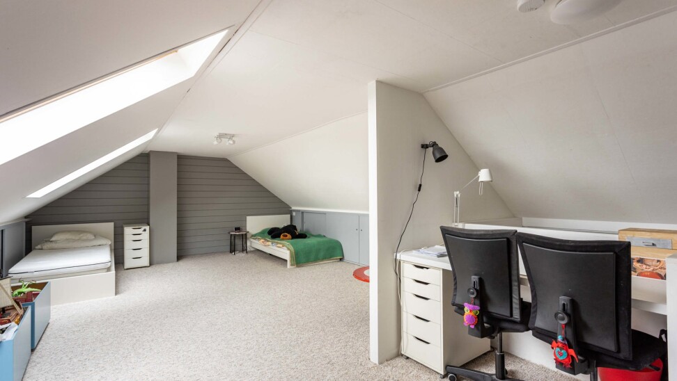 De zolderverdieding (35m²) wordt momenteel ingericht als grote slaapkamer en bureauruimte.
