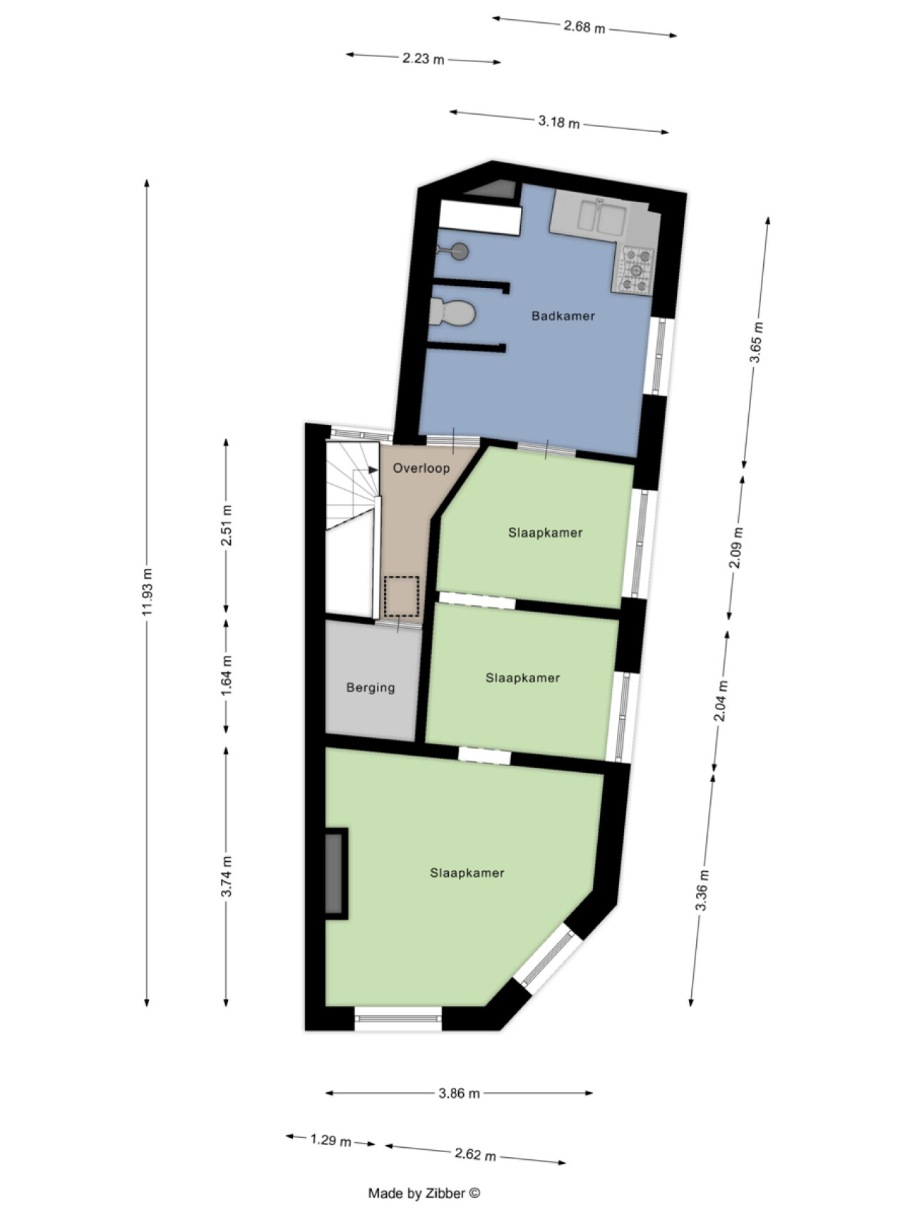 De tweede verdieping omvat een douchekamer met toilet, een slaapkamer (12m²) en een extra grote leefruimte die eenvoudig kan worden opgedeeld in twee slaapkamers van 15m² en 12m².