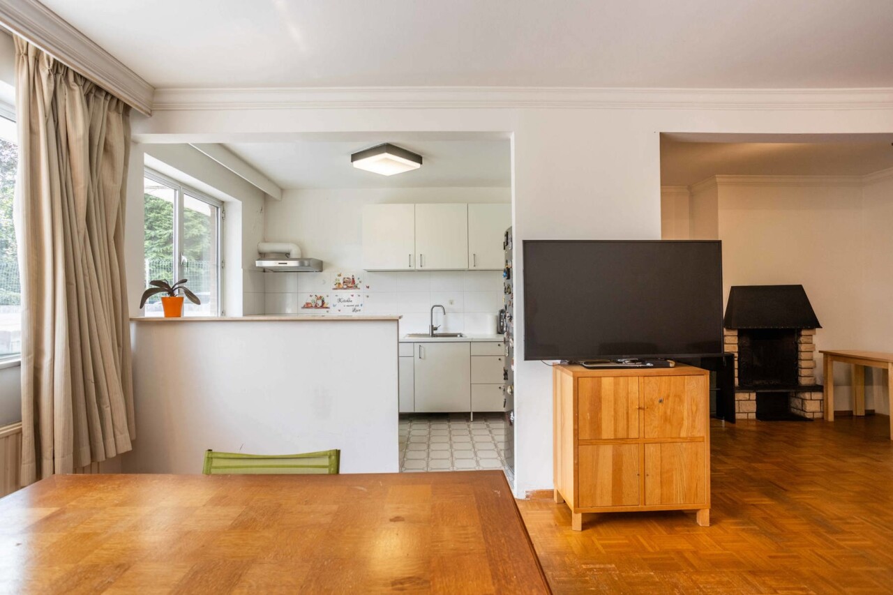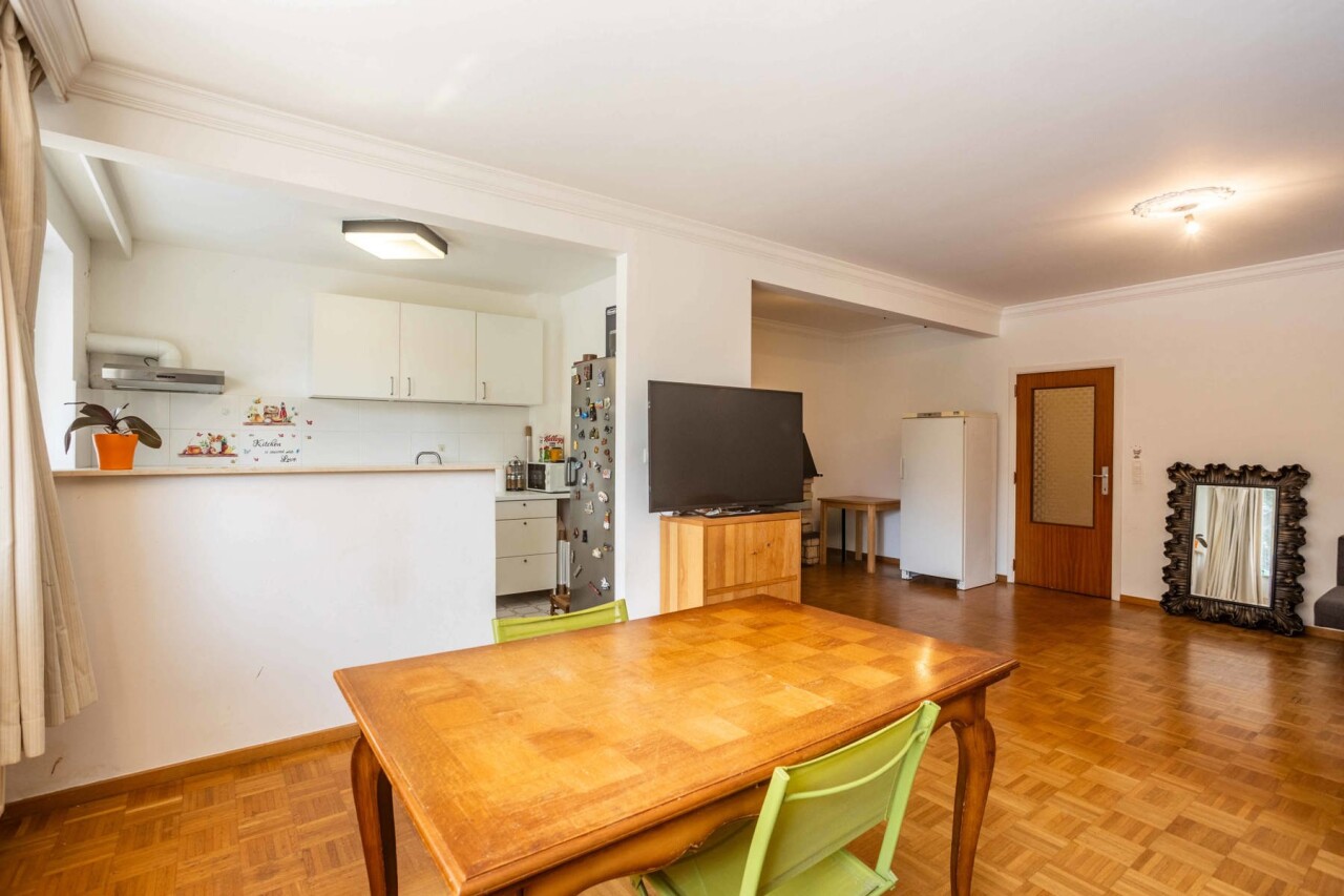 We komen binnen in een ruime inkomhal (7,5m²) die toegang biedt tot de lichtrijke woon- en eetkamer (38m²). Met aansluitend de halfopen keuken. De grote raampartijen zorgen voor een aangename lichtinval in beide ruimtes