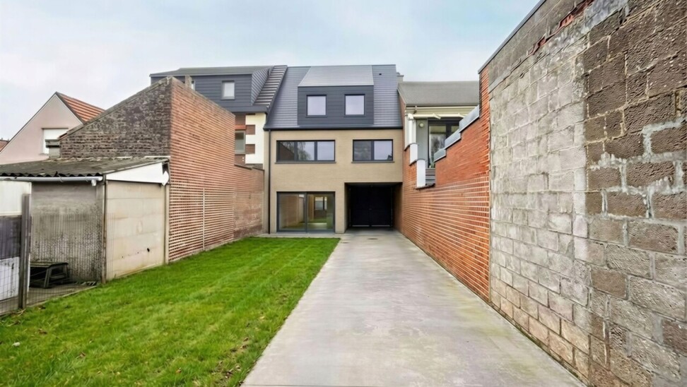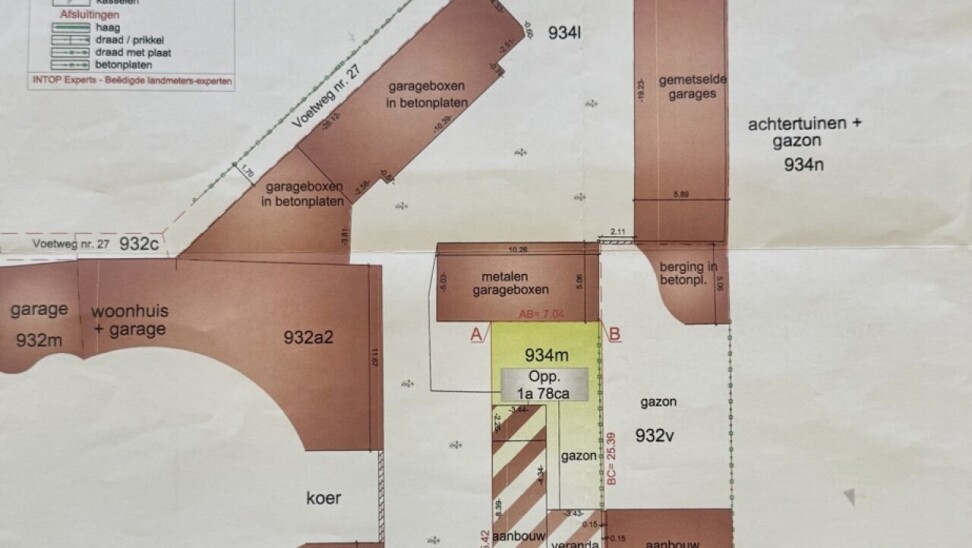 Het voorste deel van het perceel, dat momenteel dienstdoet als inrit en toegang tot de achterliggende garageboxen, is gelegen in woongebied. Dit gedeelte kan, mits het bekomen van een stedenbouwkundige vergunning, aangewend worden voor de bouw van een tweegevelwoning met een achterliggende tuinzone.
