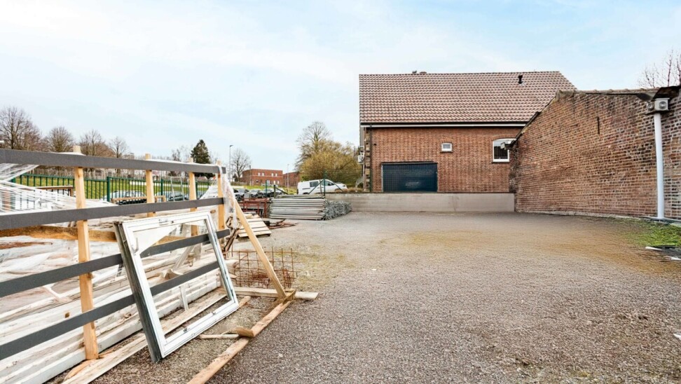 Aan de voorzijde van het gebouw vinden we een grote parking (335m²) voor zo'n 10 à 12 wagens en een oprit breed genoeg voor een grote bestelwagen.