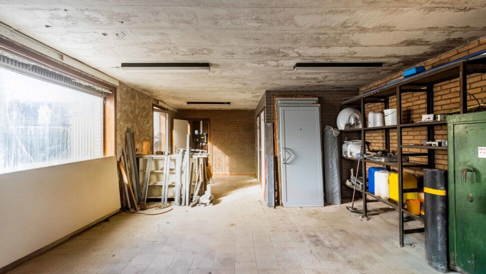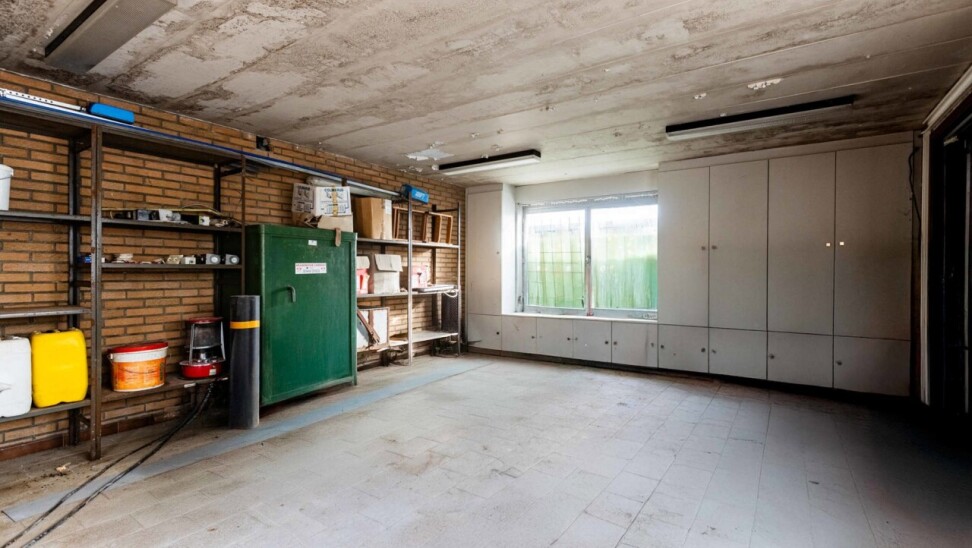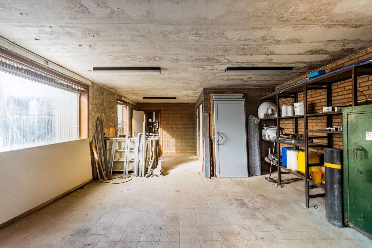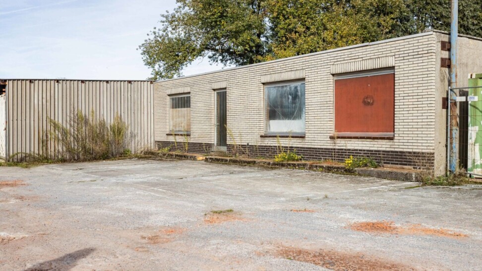 Het bestaande kantoorgebouw (±90 m²) is momenteel ingericht als een ruim bureel met toilet en berging, en een kleiner kantoor/opslagruimte ernaast.