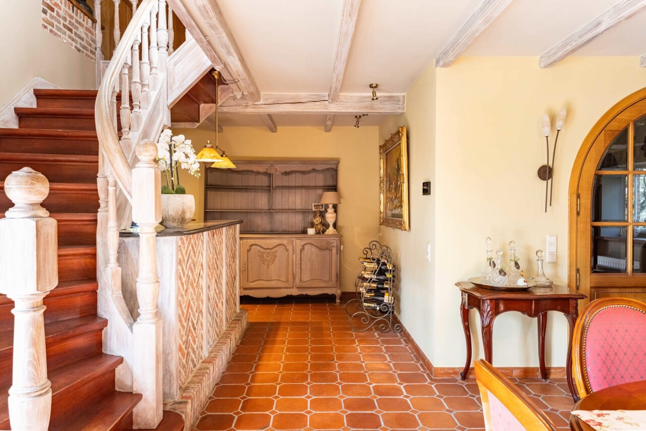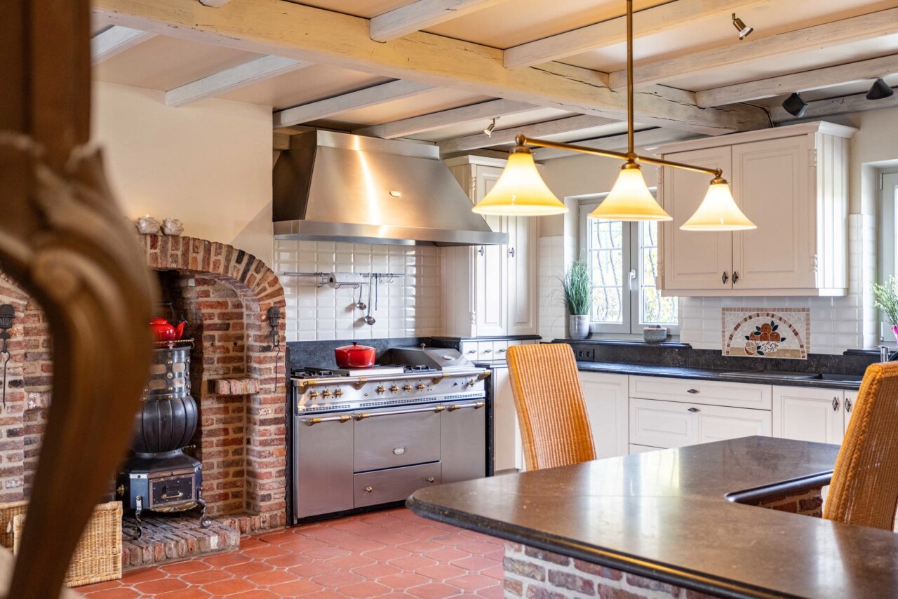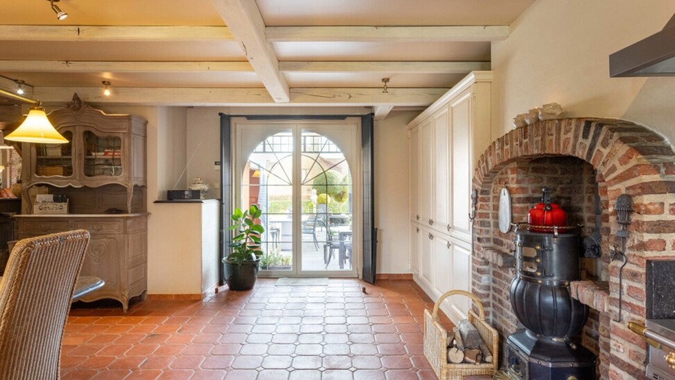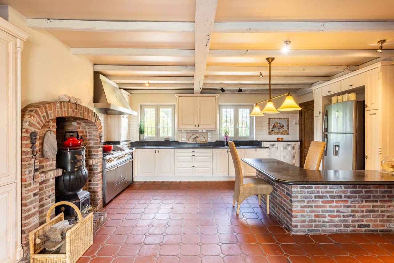 De ruime leefkeuken is volledig uitgerust en afgewerkt met kwalitatieve materialen. Vanuit de keuken heeft u directe toegang tot de pergola en het zonnige terras van 75 m², dat geniet van optimale privacy en een gunstige zuidoriëntatie.