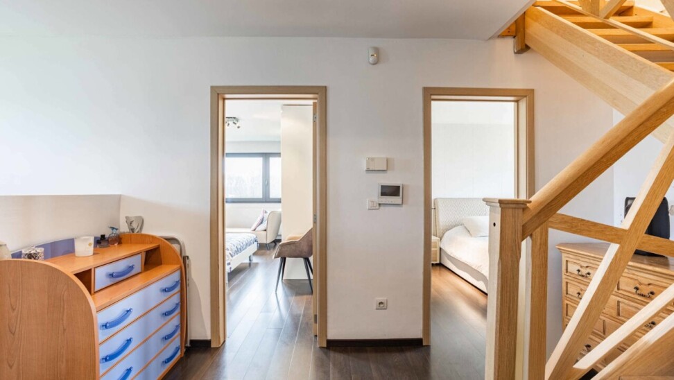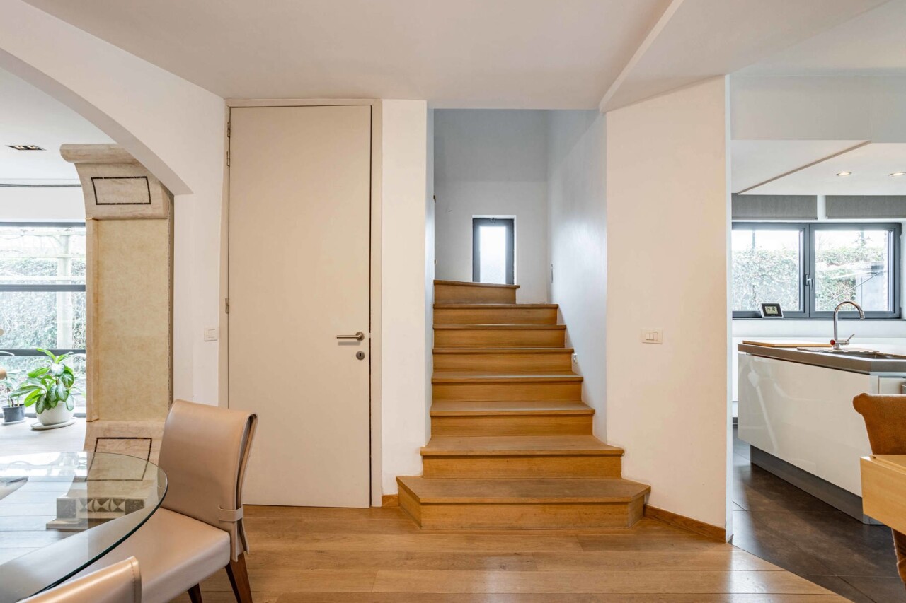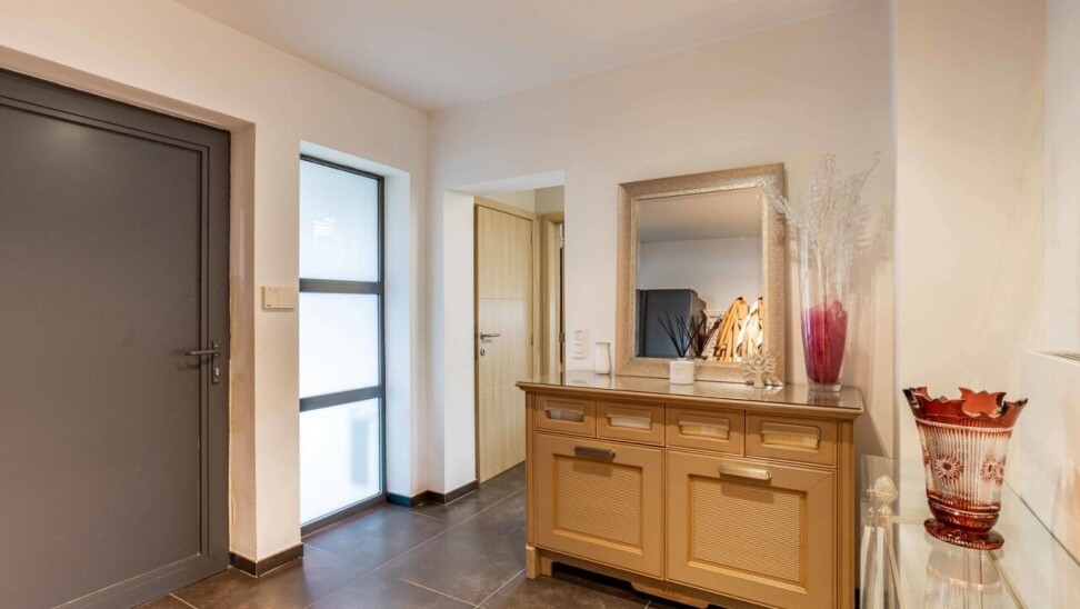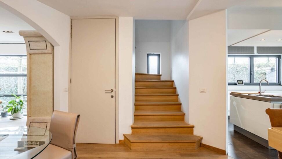 We komen binnen in een ruime inkomhal met apart gastentoilet. De hal geeft een directe toegang tot een grote bureauruimte (22m²), ideaal voor het uitoefenen van vrije beroepen. We lopen verder naar de aangename eetkamer (18m²), de volledig geïnstalleerde keuken (voorzien van alle comfort) en lichtrijke woonkamer (40m²). Vanuit de keuken en de woonkamer hebben we zicht op de aangename tuinzone dewelke geniet van een zuidoriëntatie.